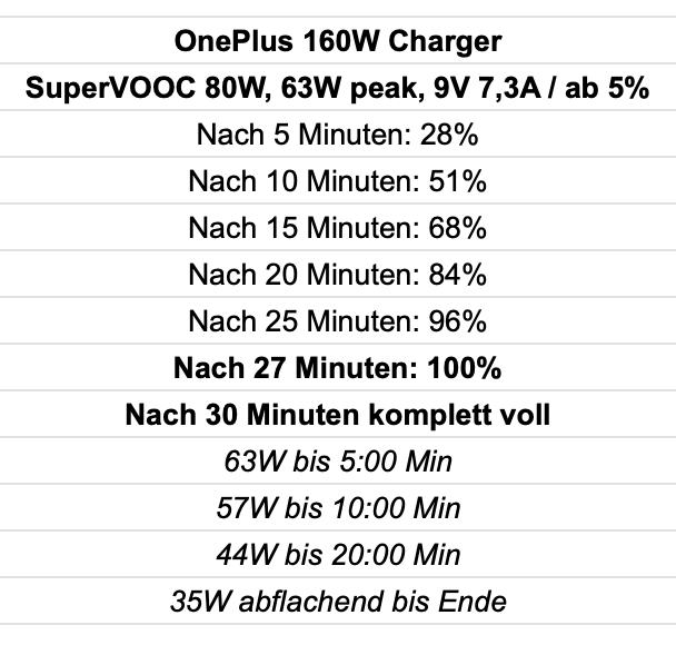 Generell sollte man bedenken, dass OnePlus, wie viele Chinesen, die Ladewerte schönt. Es kann kein 100W-Charging, 100W entspricht nur das Profil, in dem geladen wird, eben 11V 9,1A. Das Phone selbst nimmt sich aber keine 11V, sondern 8,5-9A, weshalb wir auf Nettowerte von etwa 80W herum kommen.
