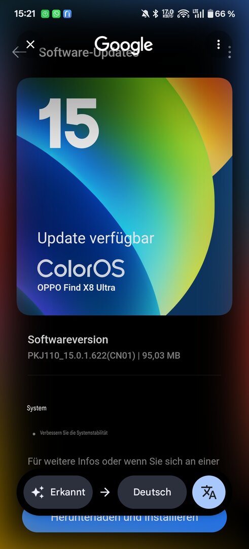 FirmwareUpdate PKJ110_15.0.1.622(CN01) für das Oppo Find X8 Ultra