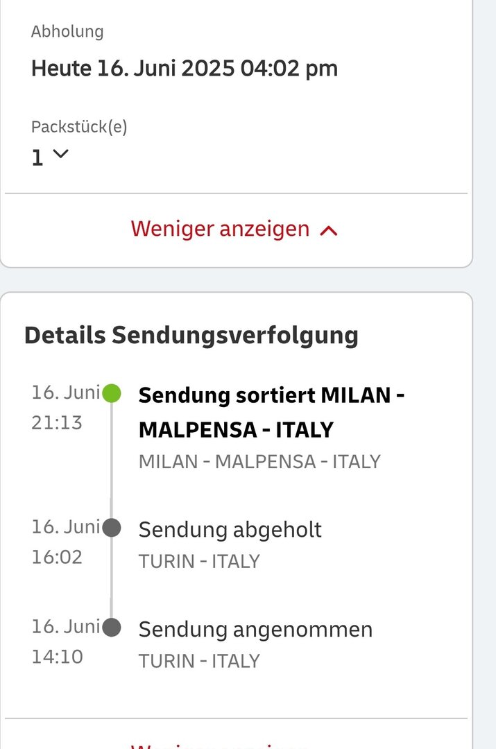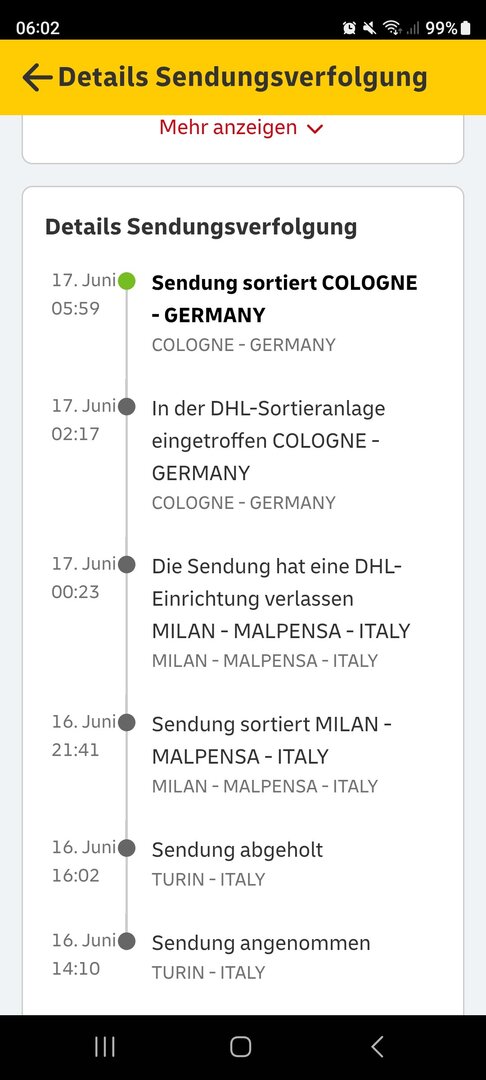Meins ging auch gestern in Italien raus. Allerdings nach Leipzig. Da ging es auch vorhin raus und tuckert wohl gerade die A9 runter nach Würzburg. Denke mal, dass am Nachmittag sollte es da sein.CallistoJaro schrieb:Das wird doch nicht wirklich Heute noch kommen..Noch 70km von mir entfernt ,wenn doch waren es 6Tage.Am 11.06 habe Ich bei Wondamobile bestellt ,versiegelt.