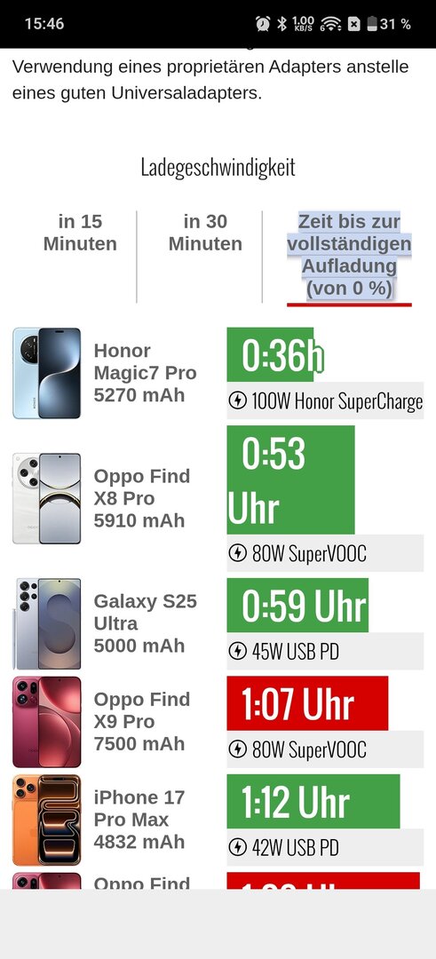 Original Supervooc Netzteil mit 80 W. Allerdings nicht das original Kabel genommen da es hier für mich zu kurz ist. Die nächste Ladung werde ich mal mit dem für mich zu kurzen original Kabel durchführen. Allerdings lade ich mit dieser Kombi mein N5 in ca 53 min auf. Mal die nächste Ladung abwarten. Die knapp 90 min empfand ich bei dieser Akku Größe allerdings nicht wirklich als allzu lange. Aber wenn es bei euch in 60 min voll ist, umso besser. Ich werde berichten.Dik2312 schrieb:@JasonMason warum dauert das Laden bei dir so lange ?