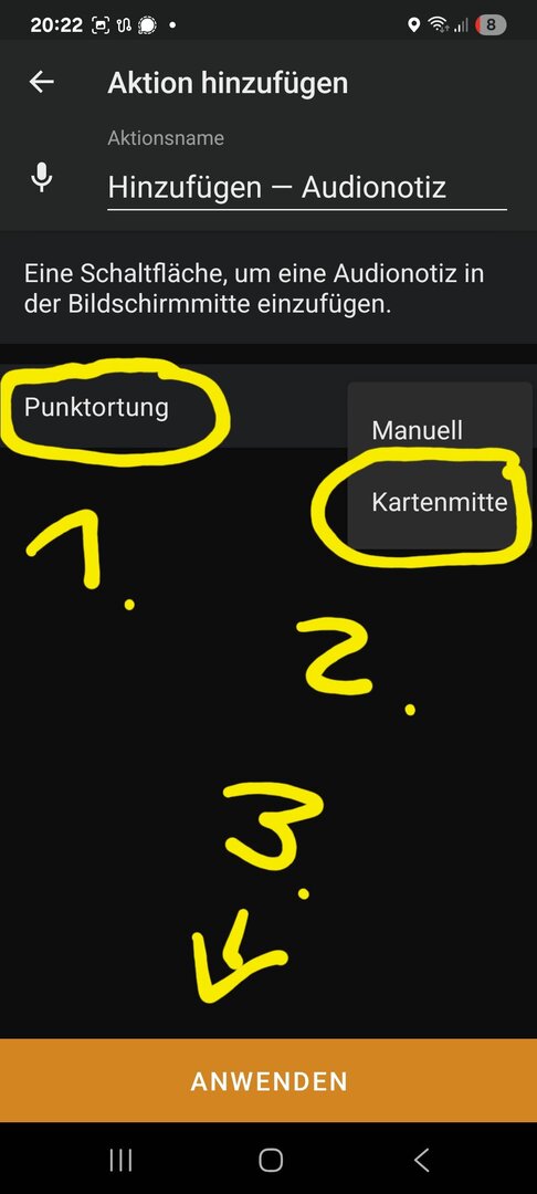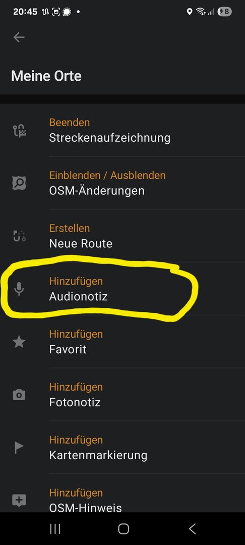 eine gute Erweiterung für OSMAND sind die Audio- und Videonotizen. Einfach auf das Widget tippen und am aktuellen Standort wird ein Ton aufgenommen. Ich nutze das v.a. während des Radfahrens, um Hinweise aufzusprechen, was an der OpenStreetmap-Karte zu verbessern ist. Einmal Tippen, Sprechen, fertig!