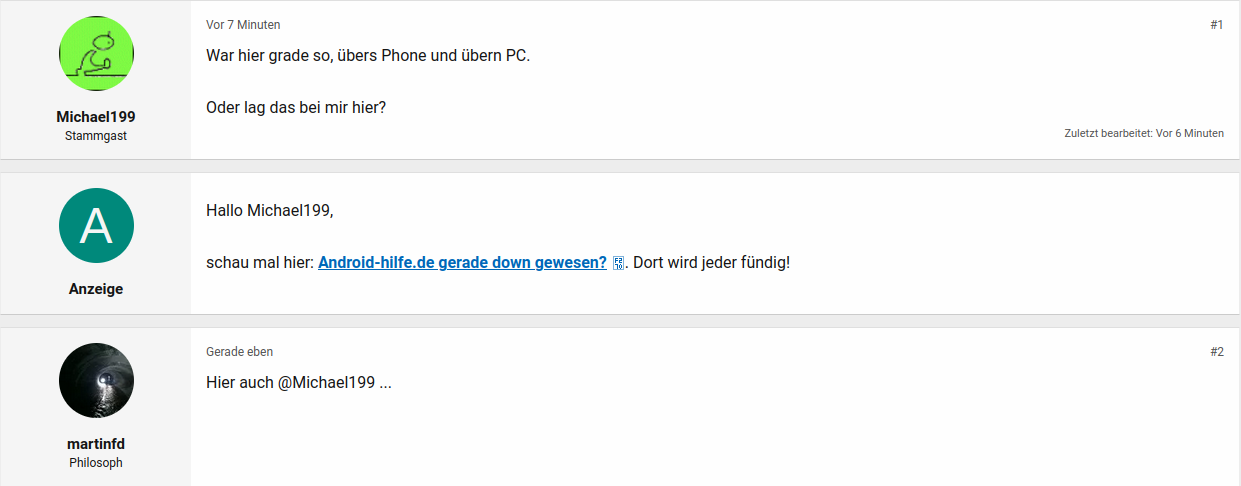 Wenn's was Gravierendes ist, gibt's im Regelfall hier eine Information: Ankündigungen & Feedback zu Android-Hilfe.de ...Michael199 schrieb:Dann haben die evtl was an der Seite gebastelt, kriegt man ja wahrscheinlich keine Info drüber, oder doch?