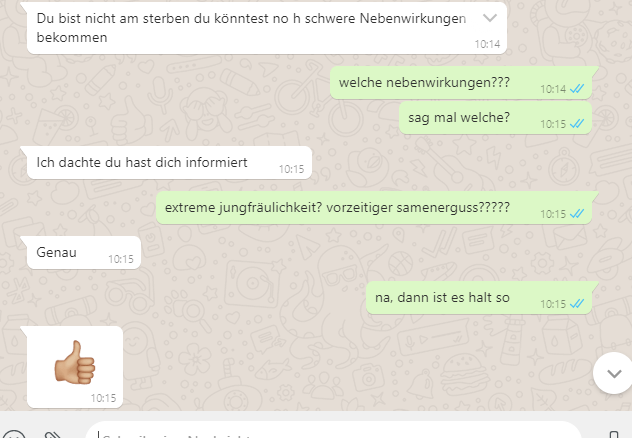 Ah ja, ich werde schwere Nebenwirkungen haben. Und er weiß es ja genau das in 3-5 Jahren ich Tod sein werde, weil es ja "alle" sagen (woher die Leut immer diese Zahlen herhaben???)......LOL, kann da nur noch den Kopf schütteln