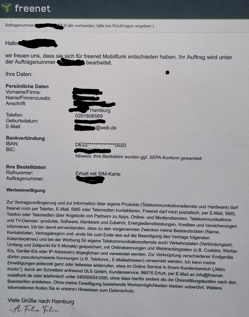 Ferner würde ich die auch schwärzen, sonst ruft gleich das gesamte Internet bei dir an... und, deine Telefonnummer aus dem anderen Schreiben gleich mit.