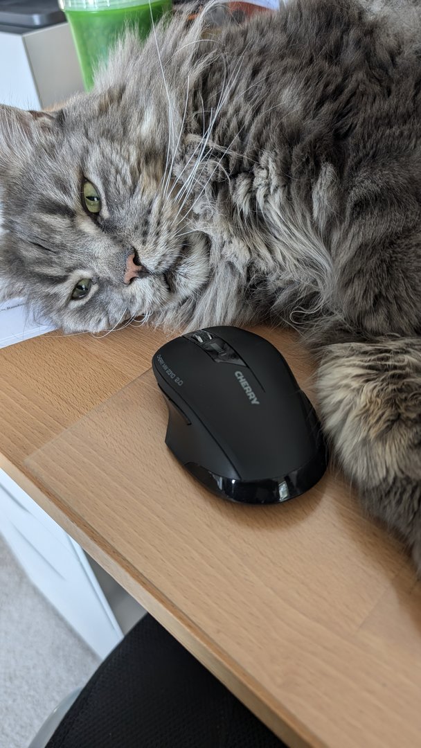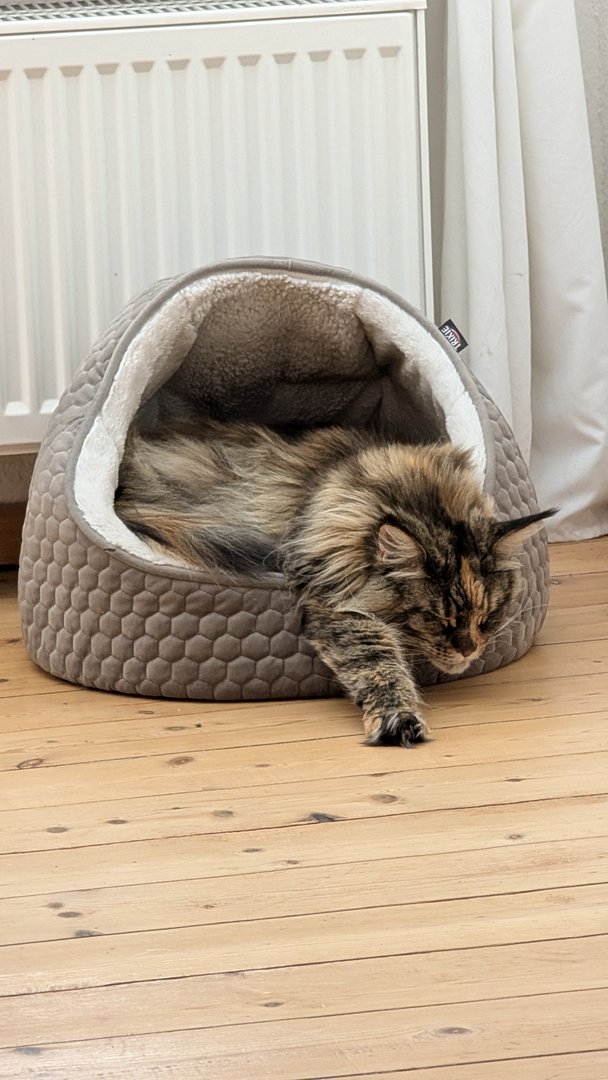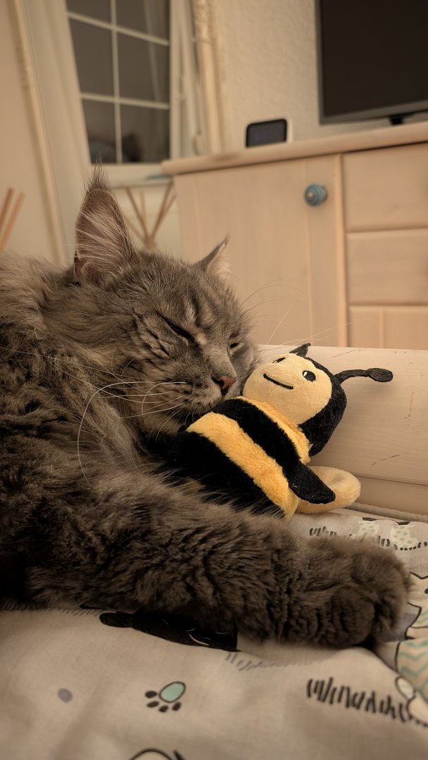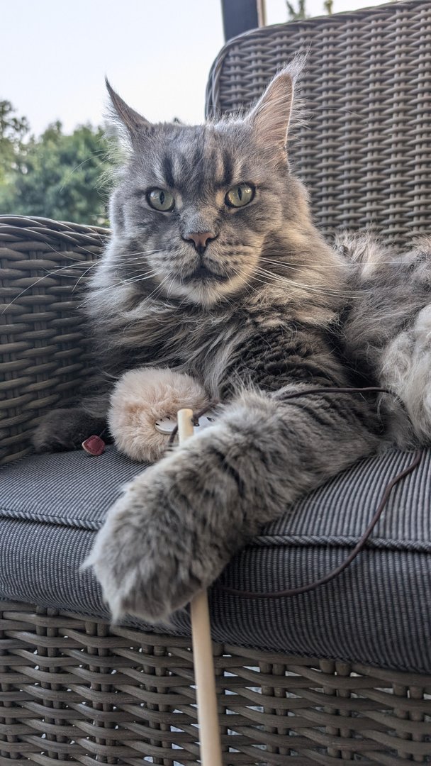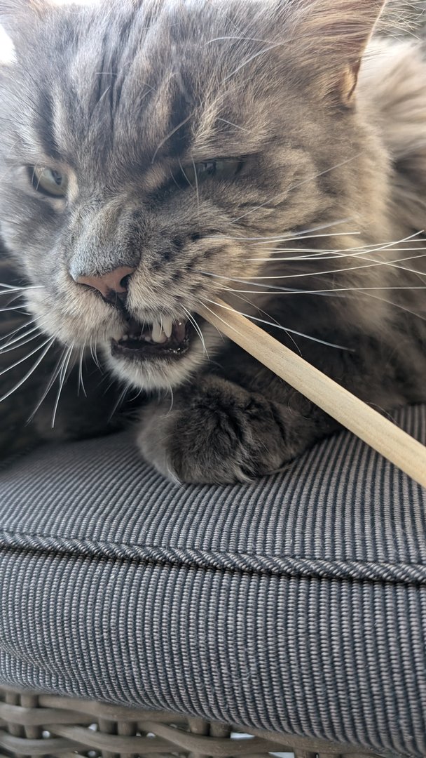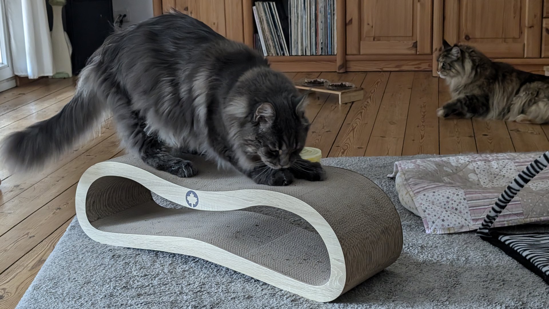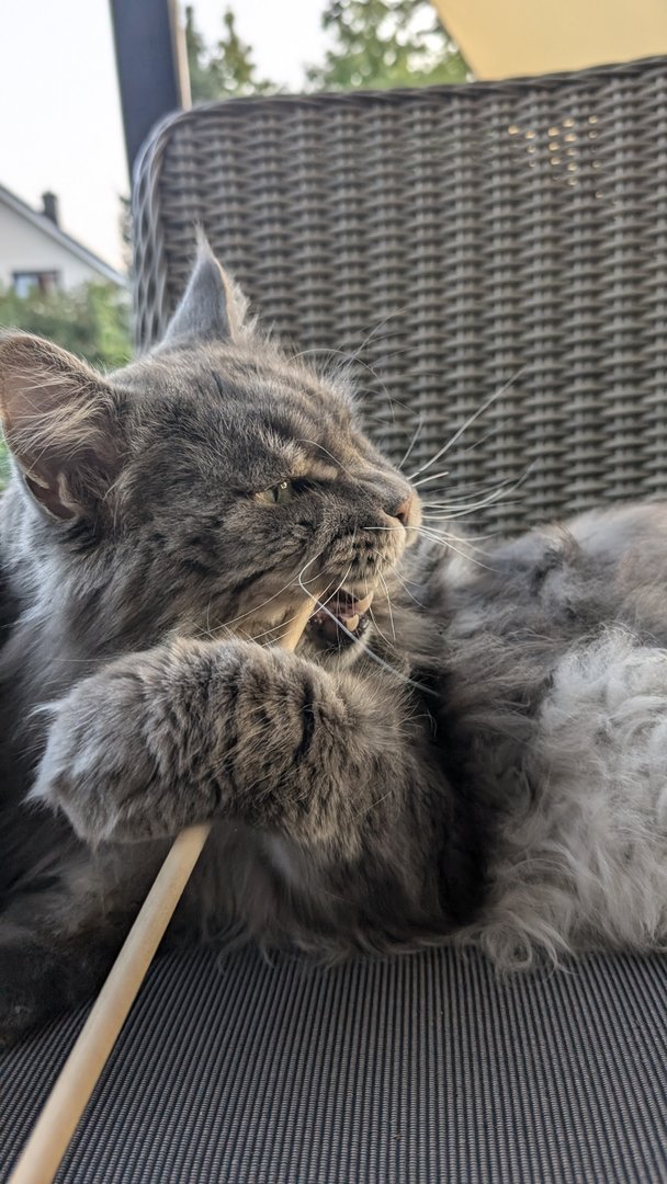 Ottos Geburtstagsgeschenk vorab. In der Versandverpackung war auch Katzenminze. Hätten wir bis zum Geburtstag (Samstag) gewartet, hätte der Kerl das Haus abgerissen - Geduld ist keine feline Starke.