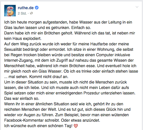) hat heute einen sehr wahren und doch so simplen Text bei Facebook verfasst. Den werde ich heute überall posten und teilen, wo ich nur kann. Hier seine Facebook-Seite. Wer auch bei FB ist bitte liken und teilen. Ich finde das immens wichtig! Und nicht falsch verstehen: ich will hier keine Werbung für Ruthe machen (die hat er gar nicht nötig). Ich mache nur Werbung für ein besseres Verständnis von einer beängstigenden Bewegung in Deutschland.