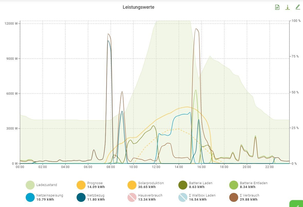 Daher hatte ich heute knapp 30 kWh Ertrag im Vergleich zu 17,5 kWh gestern.