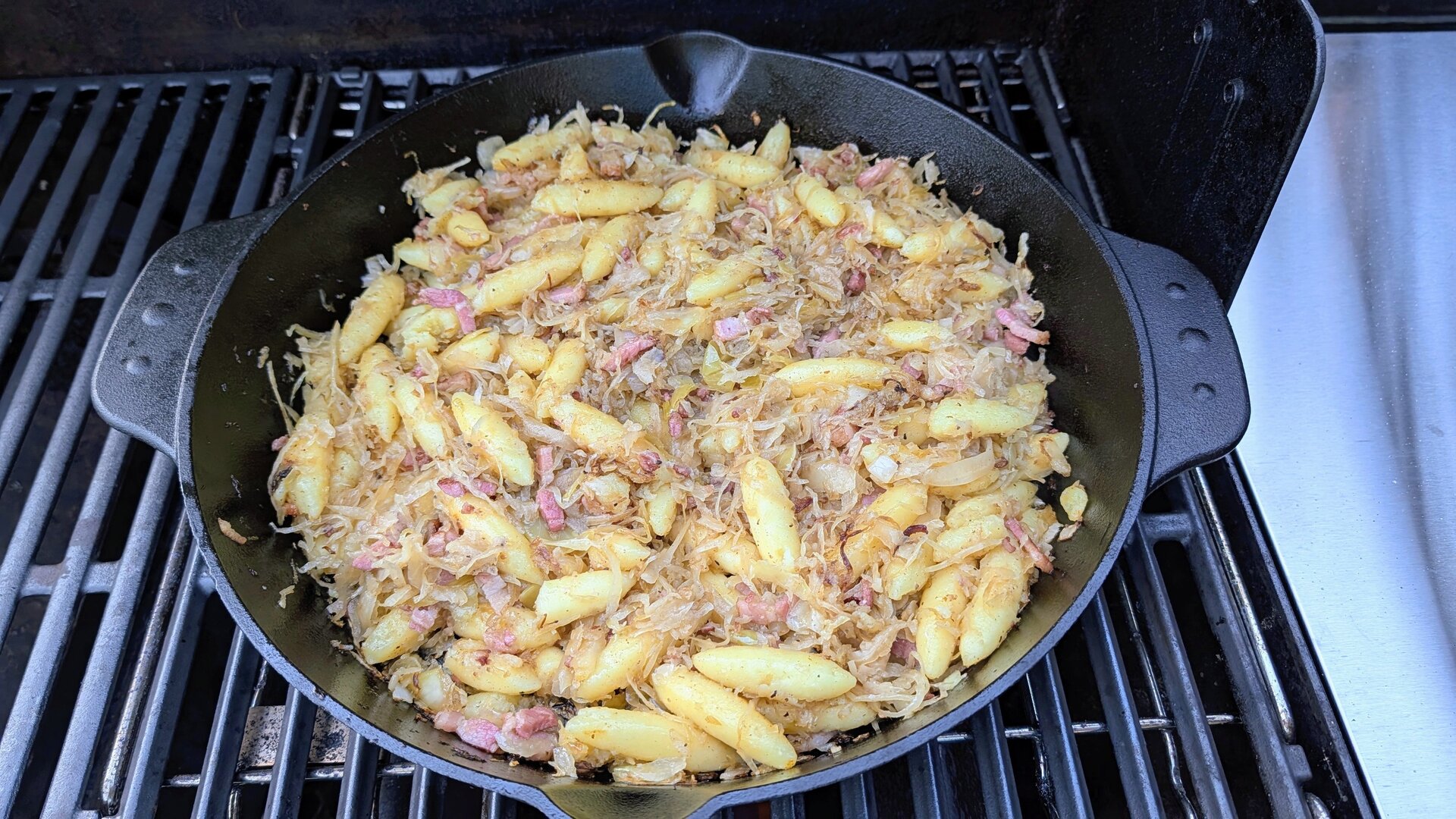 Schupfnudelpfanne mit Bacon, Sauerkraut, Zwiebeln und Gravensteiner Apfel, pfeffrig mit "Berliner Schnauze" von 030BBQ abgeschmeckt aus der großen Eisengusspfanne vom Grill. Dazu gab es Federweißen.