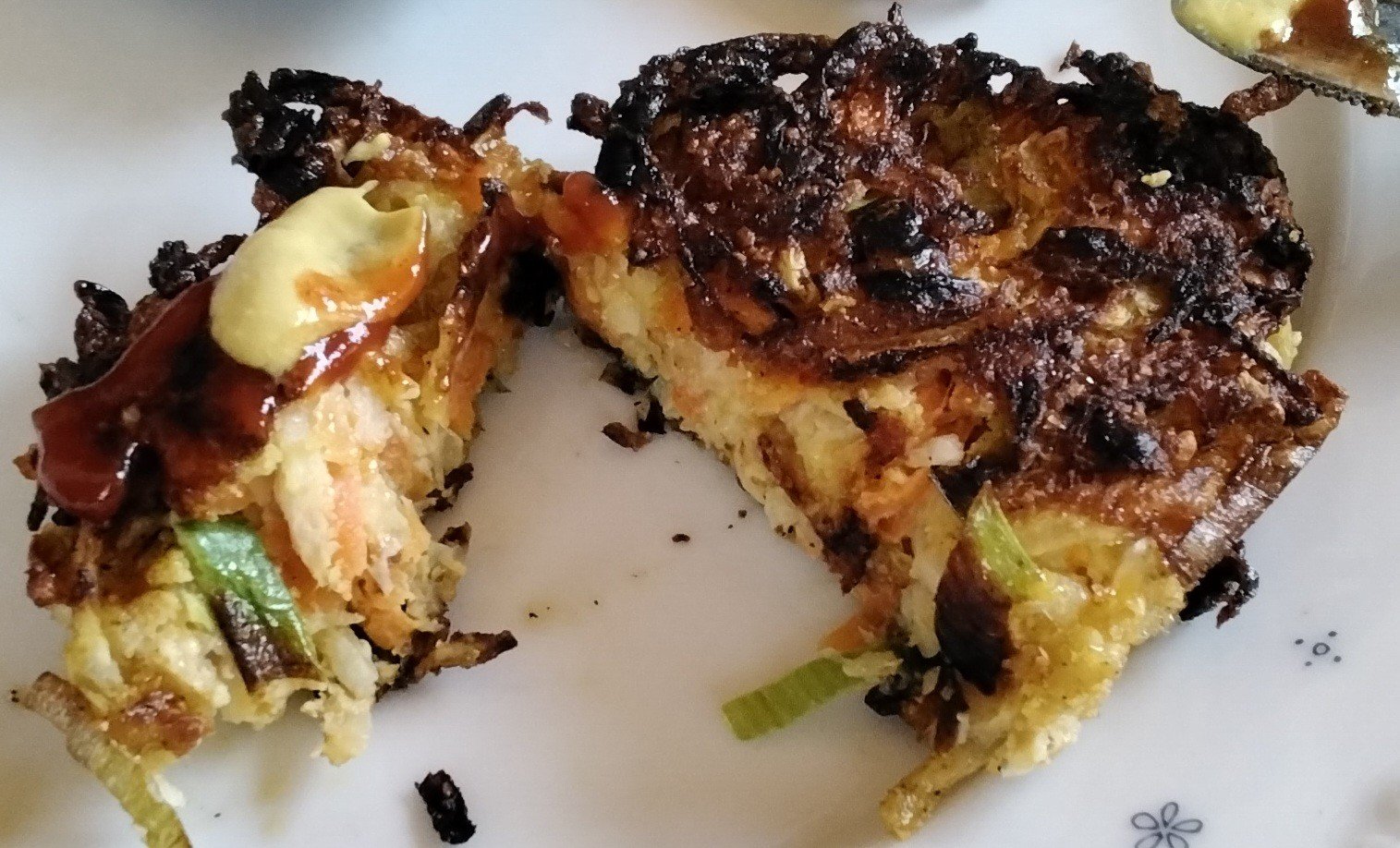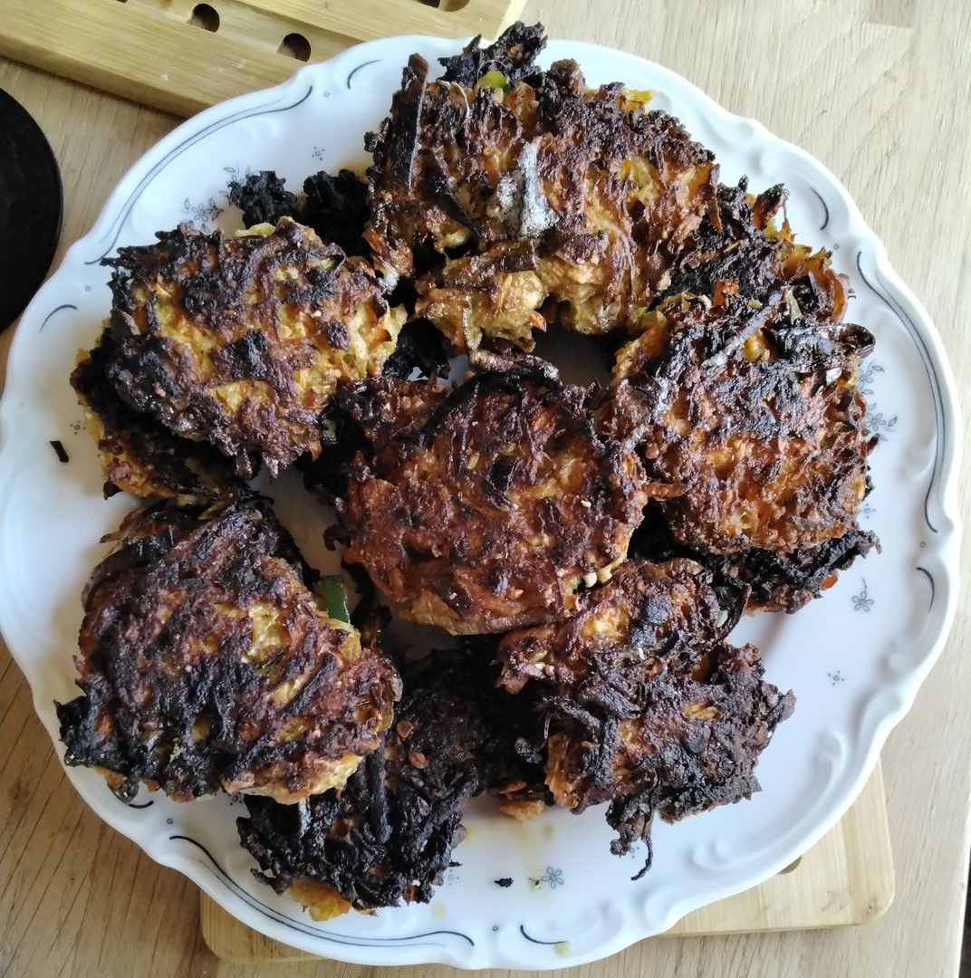 Mir war nach Gemüsefrikadellen: 500g Gemüse (Kohl, Möhren, Porree, Sellerie) grob geraspelt mit etwas Wasser oder 1Ei und 4 Eßlöffel Haferflocken oder wie hier Kichererbsenmehl, Salz, Pfeffer, Knoblauch, Sojasoße. Nur wenig durchrühren, in den Händen pressen und in viel Öl nicht zu heiß ausbraten. Nur 1 Mal wenden.