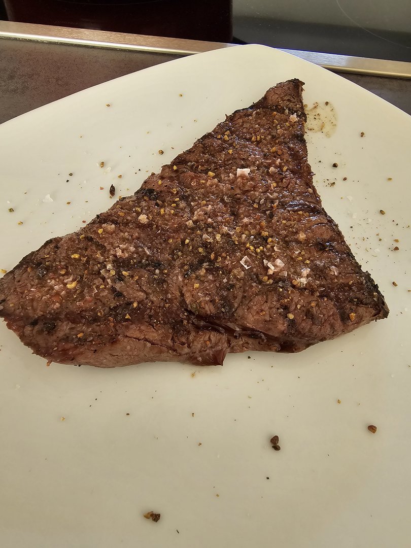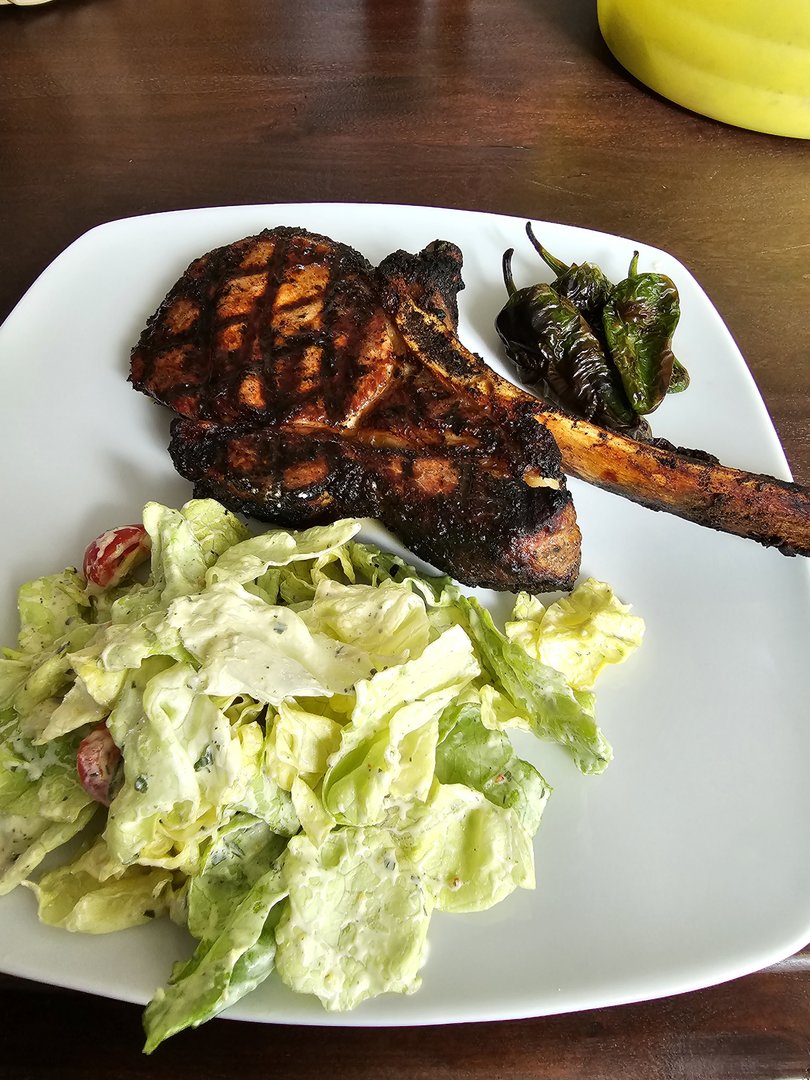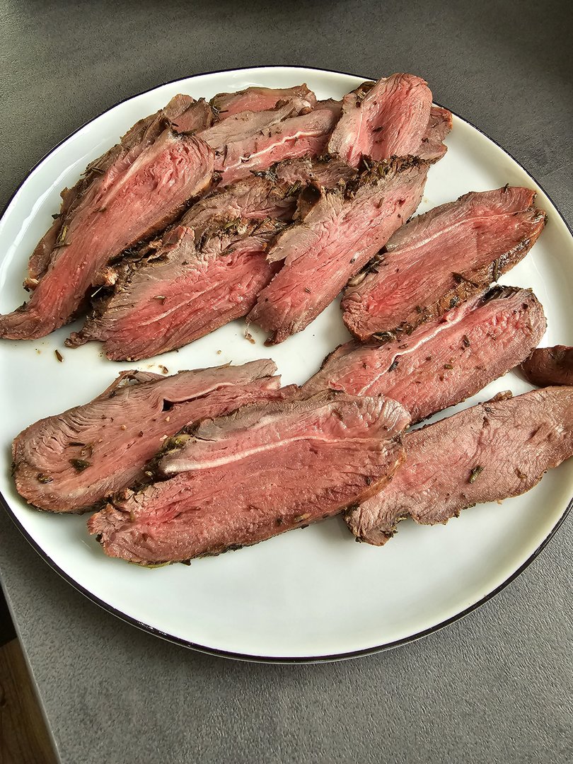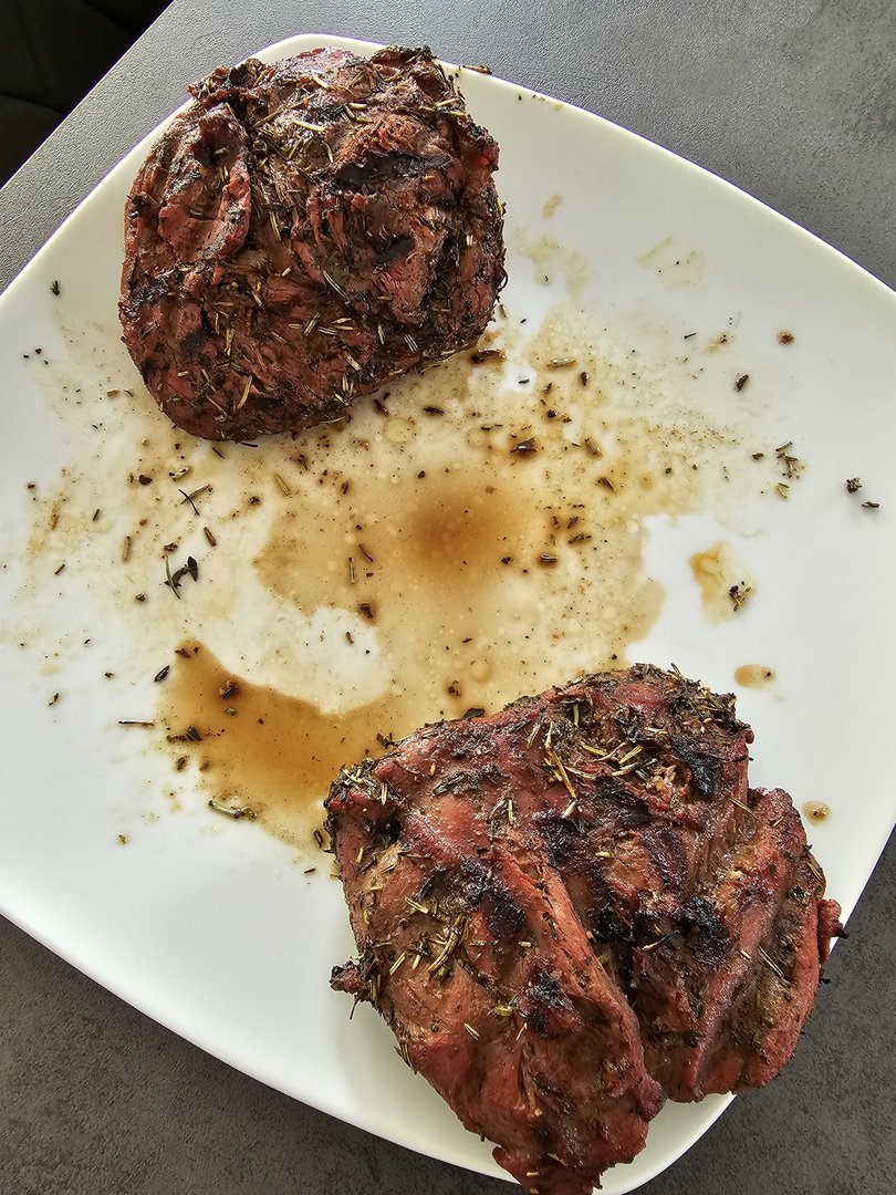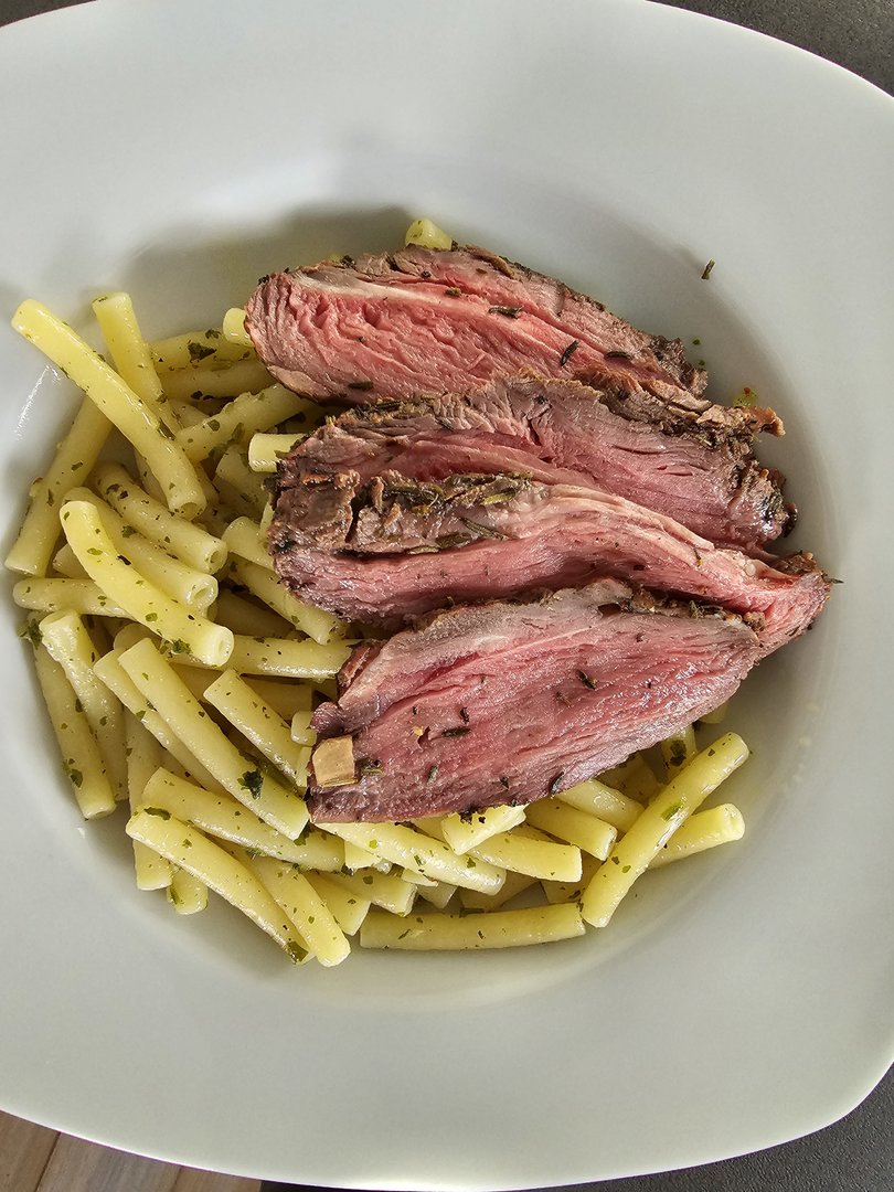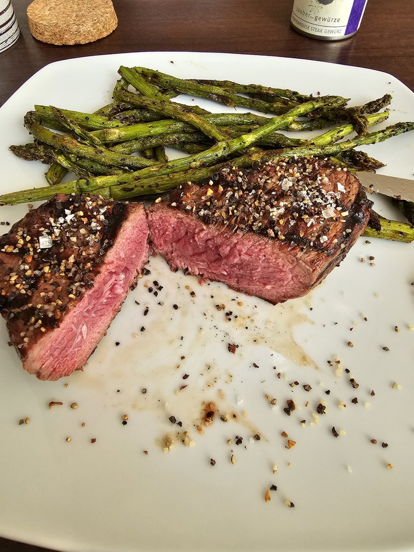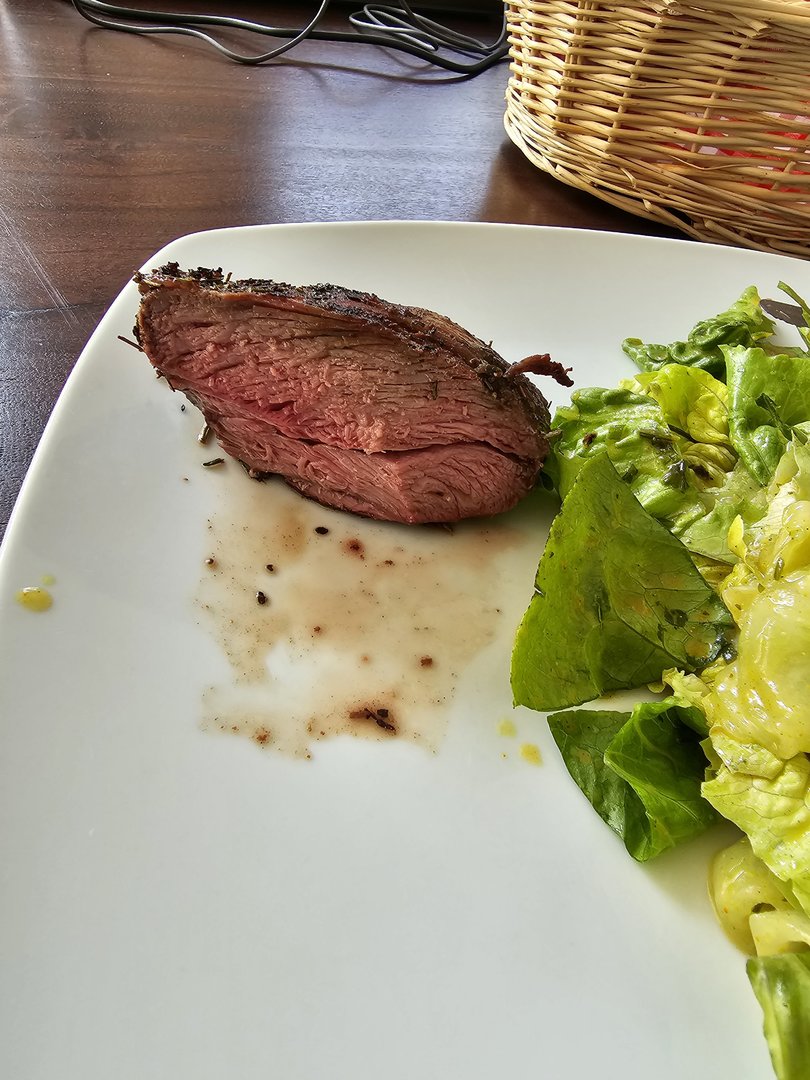 Heute gab es gesmokete Lammhüfte mit Salat. Das Lamm mit Olivenöl, Balsamico, Kräutern und Knoblauch mariniert. Dann bei 107 Grad bis 54 Grad Kerntemperatur auf den Smoker und anschließend scharf angegrillt. Ich werde Lamm wohl nur noch so essen...