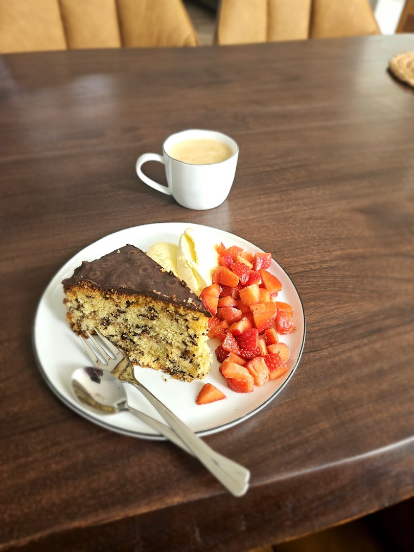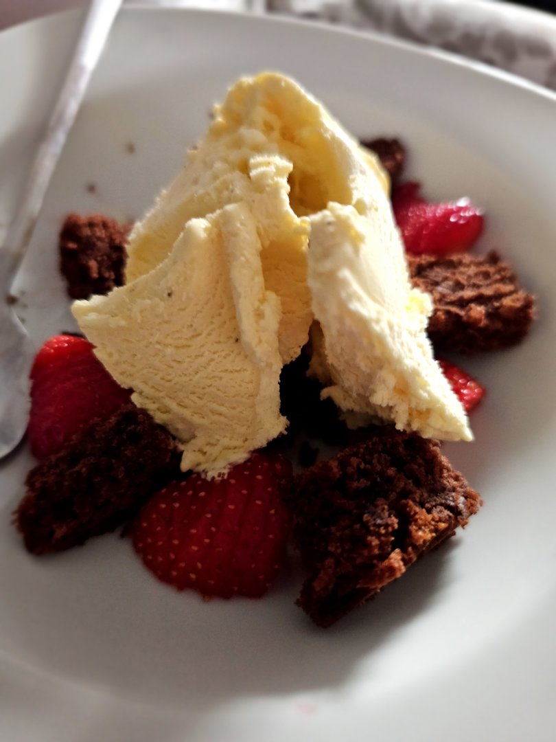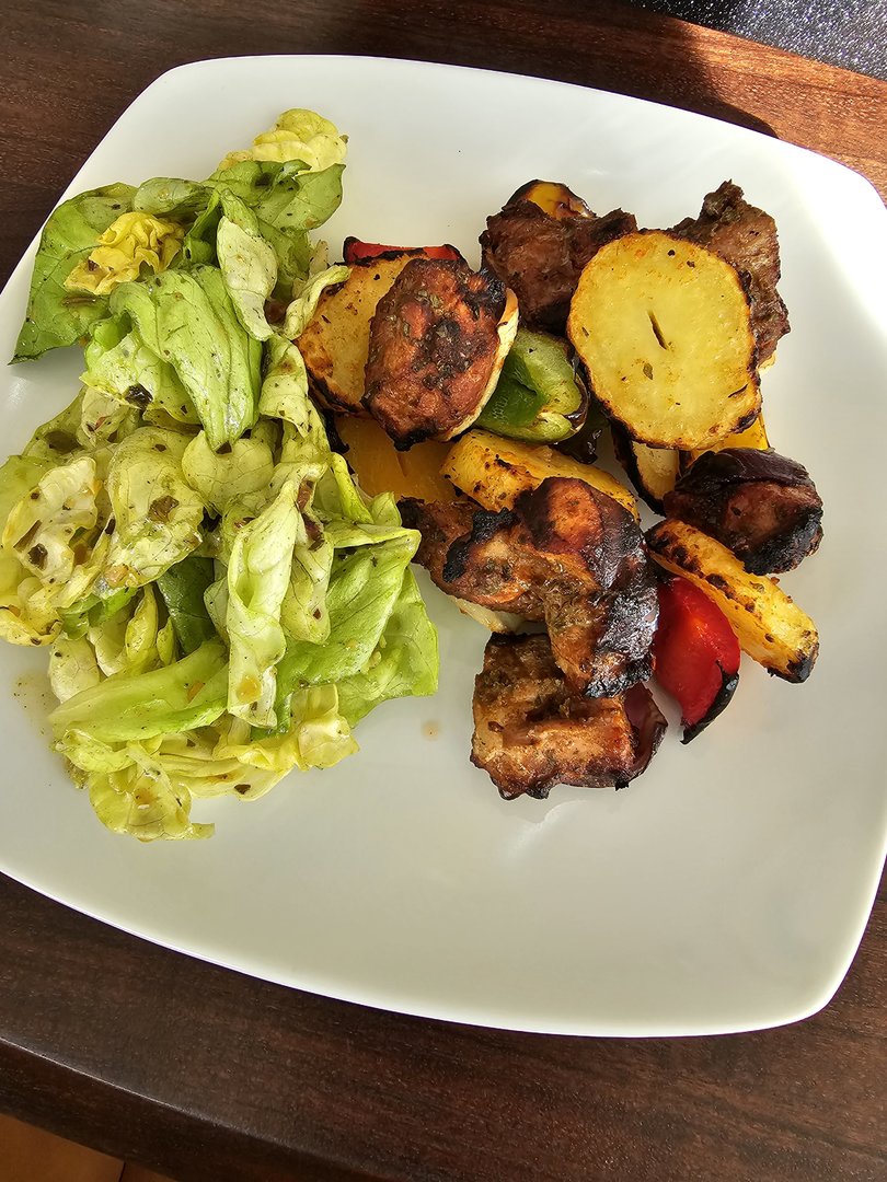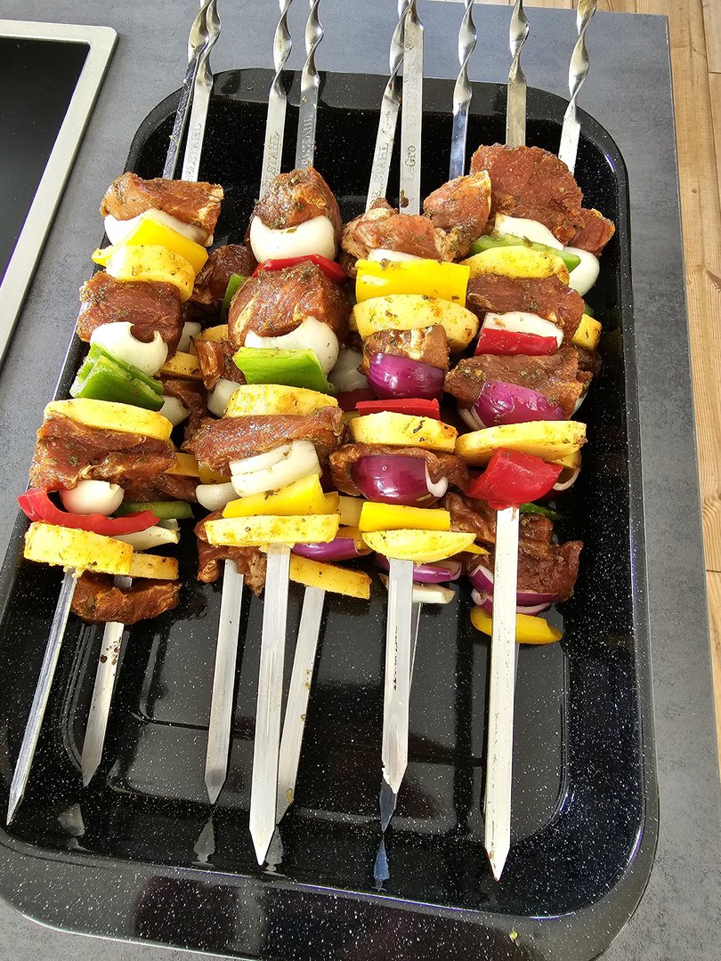 Gestern wurde es spießig... Schweinenacken gewürfelt und mit Zwiebeln, Paprika und Kartoffeln gespießt und gegrillt. Zum Nachtisch Kuchen mit Erdbeeren und Vanilleeis. Das Leben ist schon lecker