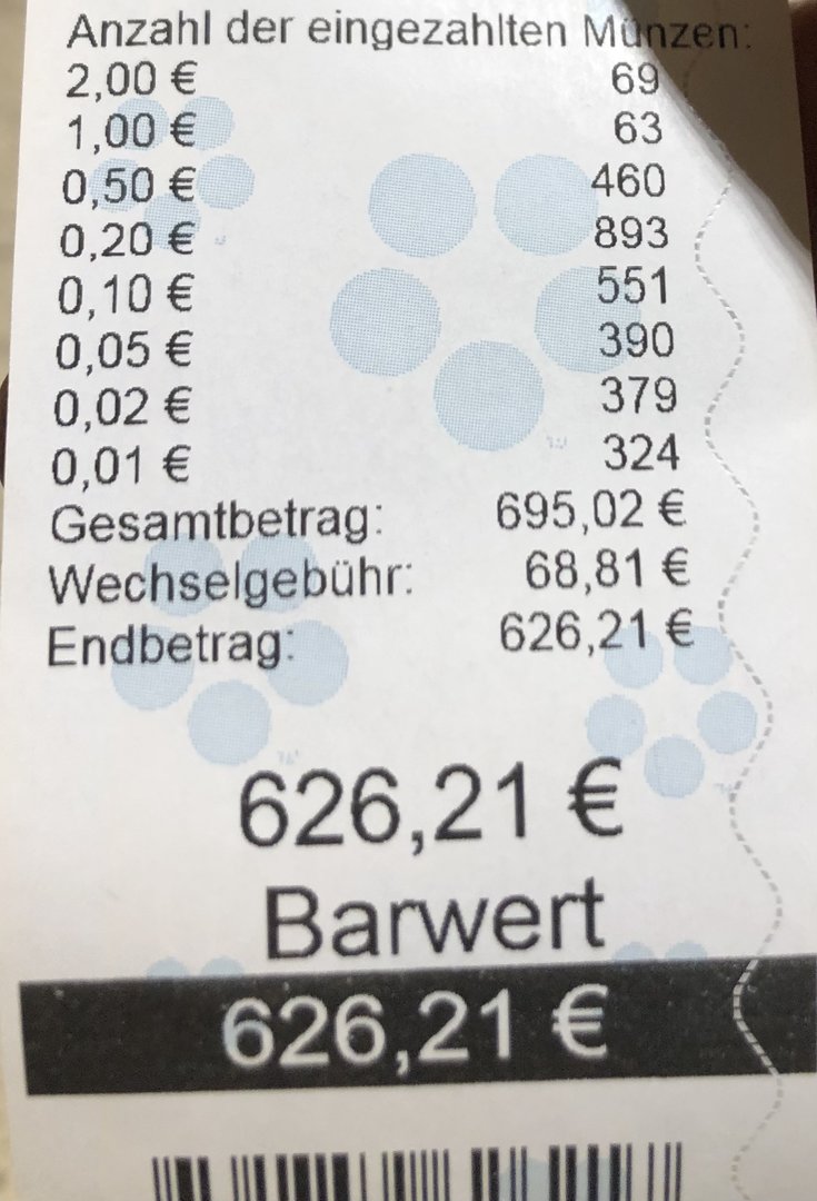 Leider musste ich mit Schrecken feststellen, dass meine Bank die Wechselautomaten abgebaut hat. Ersatzlos. Also musste ich einen der „freien“ Automaten nutzen und denen 10% der Gesamtsumme in den Rachen werfen.
