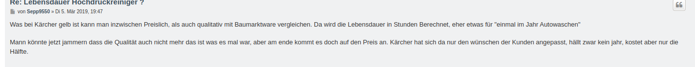 Ist wie bei Kärcher, die normalen haben fast nur Plastik im Gehäuse, erst die richtig teuren Hochdruckreiniger (graue Serie) haben dann Messing und anderes Metall verbaut.SirMarc schrieb:@kingoftf Bosch kauft man auch nur Autozubehör, nicht zum Arbeiten.