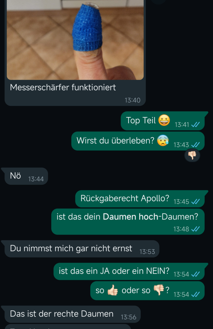 Der "Daumen hoch" Daumen ist in der Regel auch der "Daumen runter" Daumen. So gesehen, hast Du alle Möglichkeiten.balu_baer schrieb:Blöd nur, es ist ihr "Daumen hoch"-Daumen.