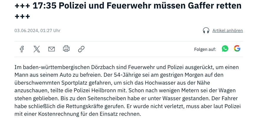 Super Idee, wenn man dann (zwangsläufig) Rettungskräften im Weg steht.DOT2010 schrieb:@Monteverde Was sollen die Leute machen wenn die Frei haben? Dann schaut man sich das unvermeidbare Spektakel an, auch wenn ich es nicht mag es so zu nennen. Für die Leute ist es aber denn nicht jeder hat sowas schon mal erlebt. Find es auch nicht schlecht, gerade Kinder und Jugendliche sollten dies mit eigenen Augen sehen welche Kraft Wasser haben kann und wie gefährlich sowas auch sein kann. Denn lernen sie vielleicht die Natur zu achten und auf sich und andere.