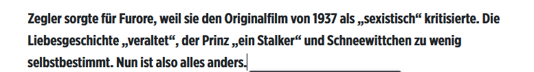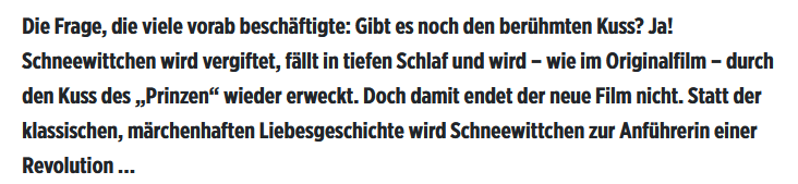 Wobei man sagen muss, dass Monarchien ja eigentlich auch ausgedient haben sollten. Vielleicht hätte Disney sich noch mehr bewegen sollen. Statt Königin eine Präsidentin eines erfolgreichen Unternehmens nutzen, deren Mann ständig hinter der Tochter her ist, so das sie mit ihrem Freund dem Wachmann flieht und sich einer Gruppe anschließt, die gegen die Machenschaften der Firma vorgeht.