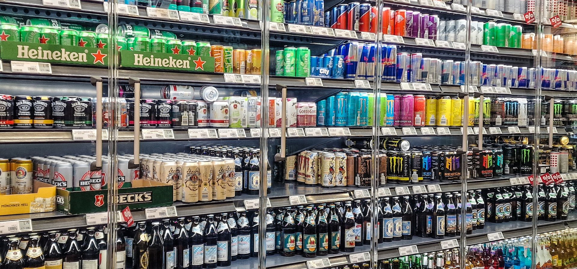 Eine Kühlwand voller Alkohol und Soft drinks.![]()