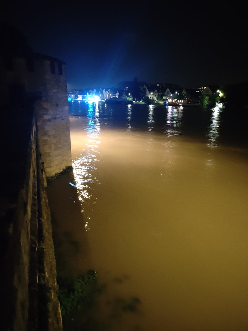 Hier ein Foto zu besseren Vorstellung (von der Nibelungenbrücke aufgenommen also in den Bildern die östliche Brücke), die Pegelstände des Jahrhunderthochwassers werden sicher nicht erreicht.