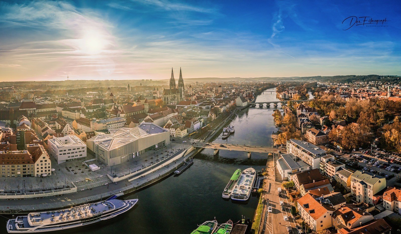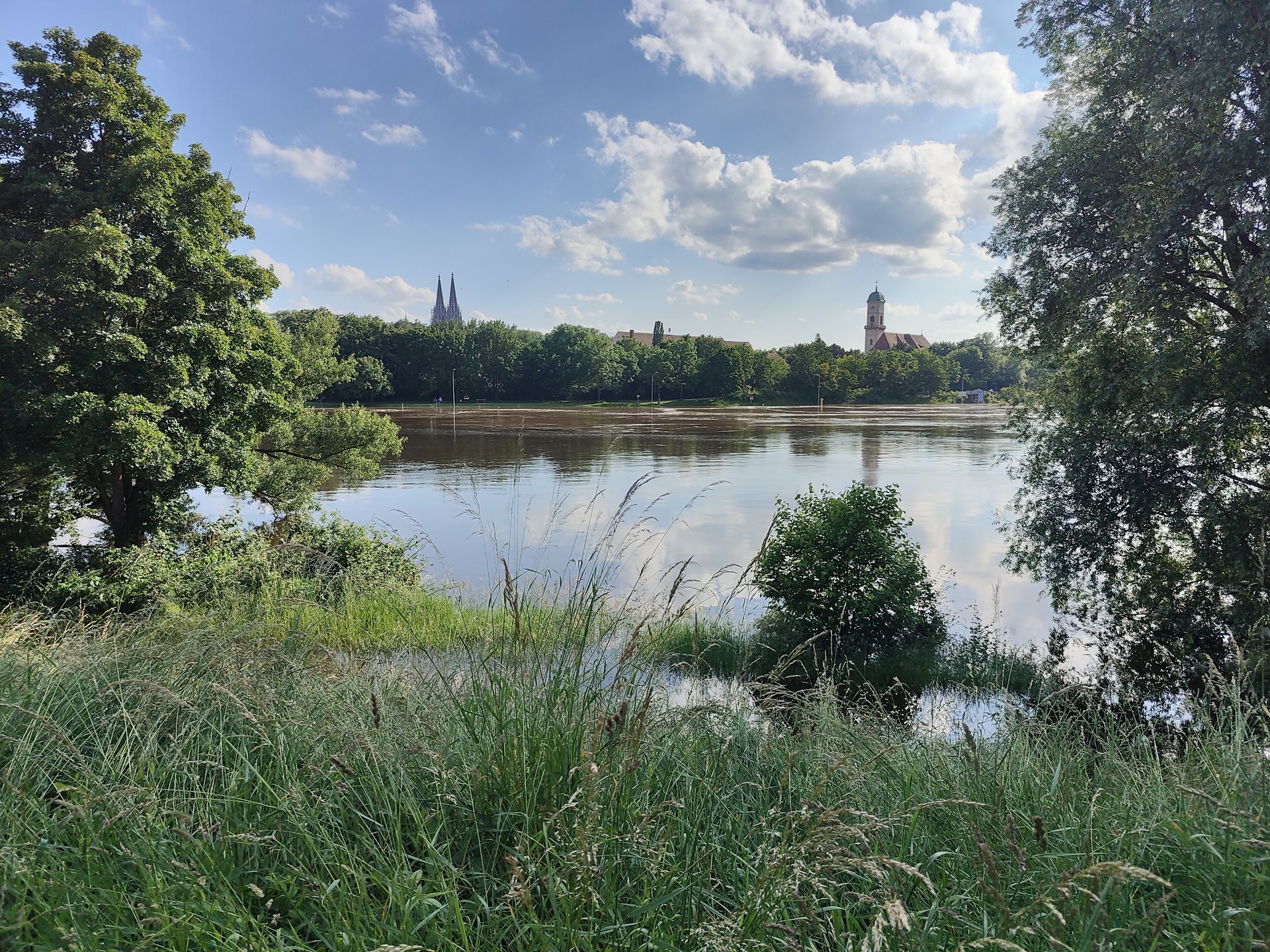 Hier mal ne Luftaufname (nicht von mir, mal im Netz gefunden) wie es normal eigentlich aussieht. Die 2te Brücke oben (historisch) ist die steinerne Brücke und da sieht man bei normalem Wasserstand auch die bottsartigen Fundamente. Selbst in diesem Bild scheint es das etwas höheres Wasser in d. Donau war bei der Aufnahme.