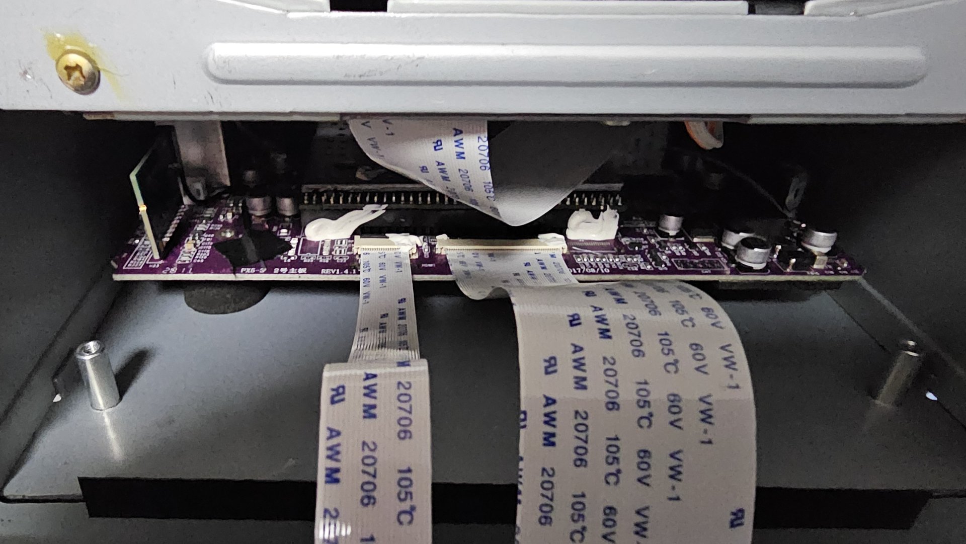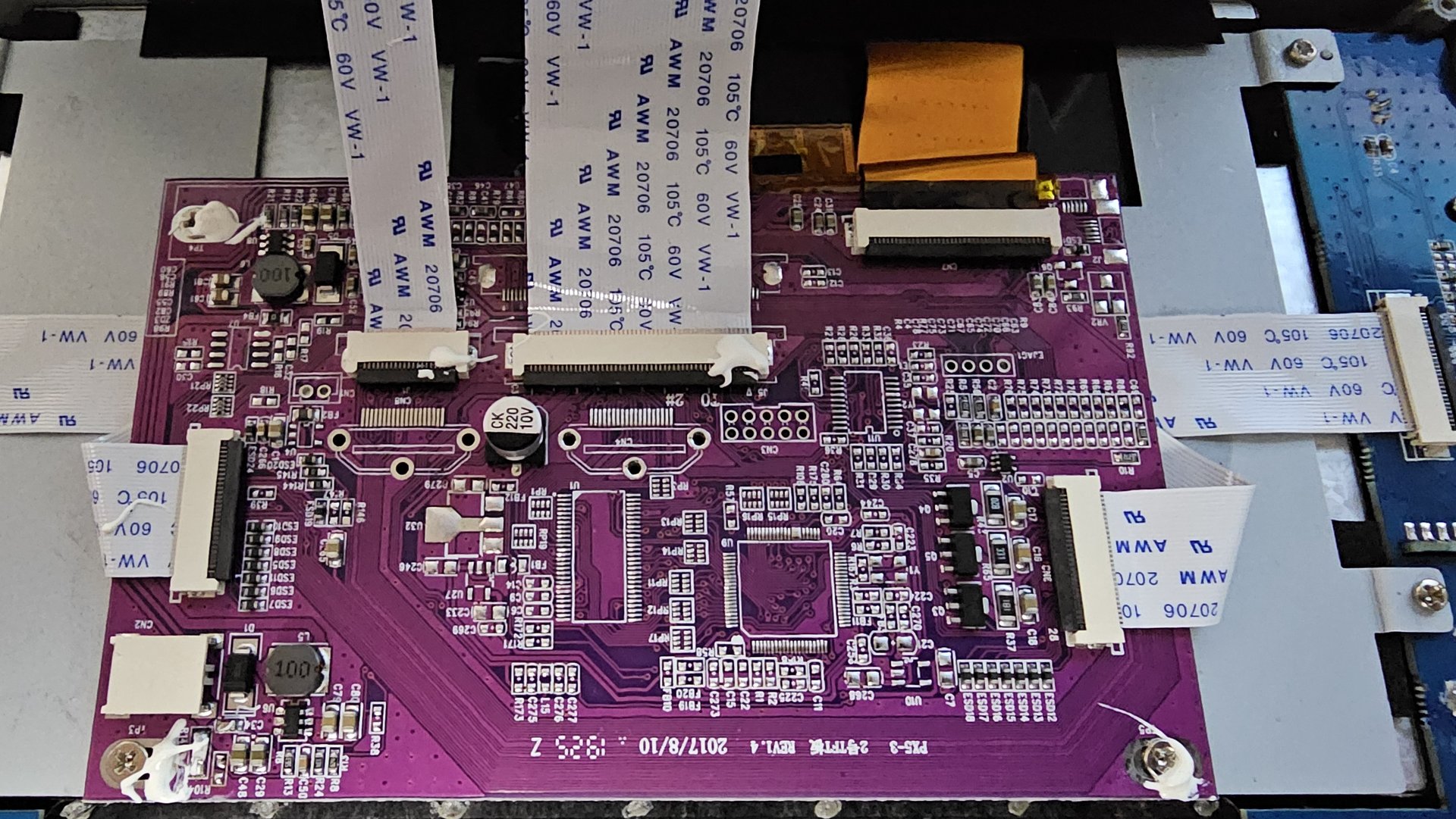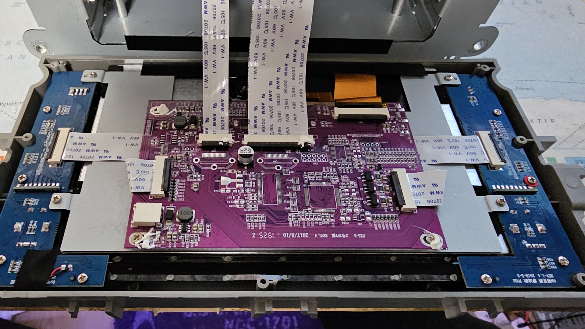 So, hier mal drei Fotos von dem Display. Man sieht ja, da ist unten eine Metalplatte, wo das Display dran ist und oben die violette Platine, die vermutlich die Displaysteuerung ist und auch die Seitentasten.