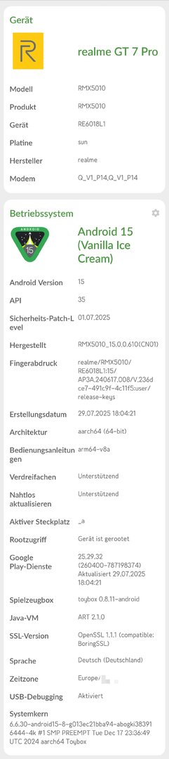 • Aktualisieren Sie Android-Sicherheitspatches auf Juli 2025, um die Systemsicherheit zu verbessern.