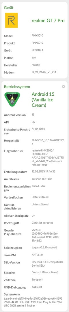 • Aktualisieren Sie Android-Sicherheitspatches auf August 2025, um die Systemsicherheit zu verbessern.