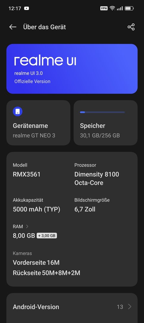 mit dem (80W) Realme GT Neo3 bist, bekommst du heute mit der RMX3561_11_C.22 (Security Patch Mai) den Wechsel von ColorOS 13.0 auf 13.1 "RMX3561_13.1.0.500(EX01)".