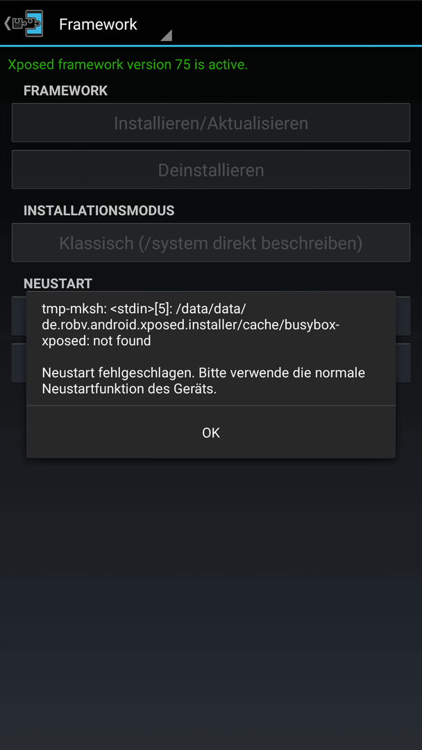 Kommt bei mir auch. Xposed funktioniert trotzdem! Einfach manuell neustarten und gut ist.