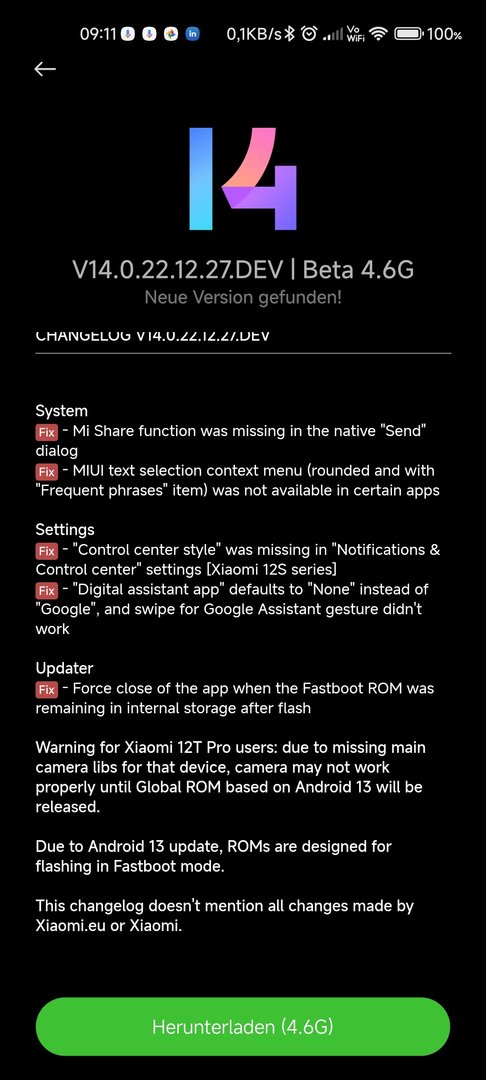 Habe mein Mi 11 Ultra vom weekly 22.10.26 auf das aktuelle Beta Rom 22.12.21 aktualisiert. Dirty flash hat problemlos funktioniert. Ich bin sehr postiv überrascht, wie stabil Android 13 mit Miui 14 läuft. Bis jetzt habe ich keine Probleme entdeckt. Klare Empfehlung.