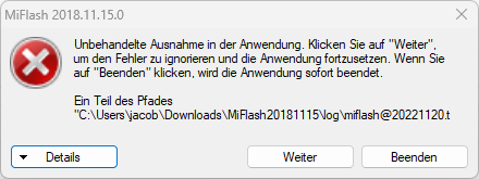 System.IO.DirectoryNotFoundException: Ein Teil des Pfades "C:\Users\Username\Downloads\MiFlash20181115\log\miflash@20221120.txt" konnte nicht gefunden werden.