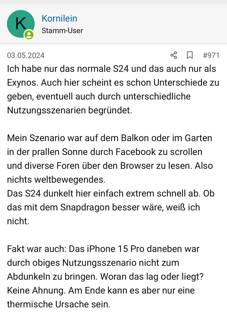 bei den Samsung Smartphones, die ich kenne (S20FE 5G, A54, S24 FE) kann das Display bei direktem Sonnenschein kurze Zeit sehr hell sein, aber schon nach ein oder zwei Minuten wird die Helligkeit deutlich reduziert, so dass man es in der Mittagssonne kaum noch lesen kann. Das ist bei Pixel-Handys anders, selbst ein recht altes Pixel 3a hat ein sehr viel helleres Display als das, was ich bei Samsung kenne und es kann dauerhaft diese hohe Helligkeit liefern.