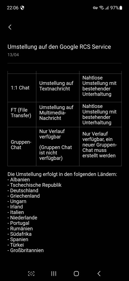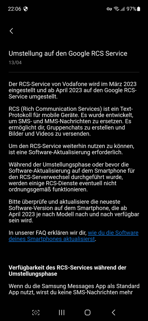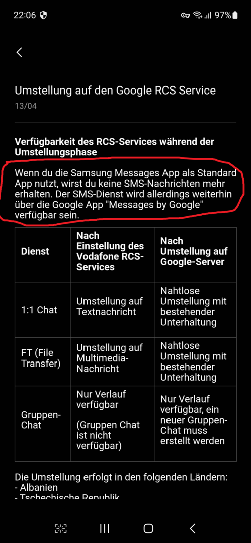 Ich habe gestern in der Samsung Members App einen Hinweis auf Veränderungen bezuglich des RCS-Service gefunden, siehe Schreenshots. Den RCS-Service habe ich deaktiviert, wenn überhaupt, dann nutze ich klassische SMS, hauptsächlich zum Empfang von Benachrichtigungen vom Provider und der Mailbox. Dafür nutze ich immer die Samsung Message App, weil sie mir vom Design besser als die von Google gefällt. Außerdem gibt es in der Google Message App keine Einstellungen hinsichtlich des automatischen Löschens von Nachrichten, was ich nicht will und ich habe gerade gestern einen Post gelesen, wo sich jemand beklagte, dass bei ihm (oder ihr) SMS gelöscht wurden, ohne eine Möglichkeit, dies zu verhindern. Die Nachricht in der Samsung Members App hat mich verunsichert. Kann ich in Zukunft über die Samsung Message App keine SMS mehr empfangen, muss ich dazu Google Message verwenden?