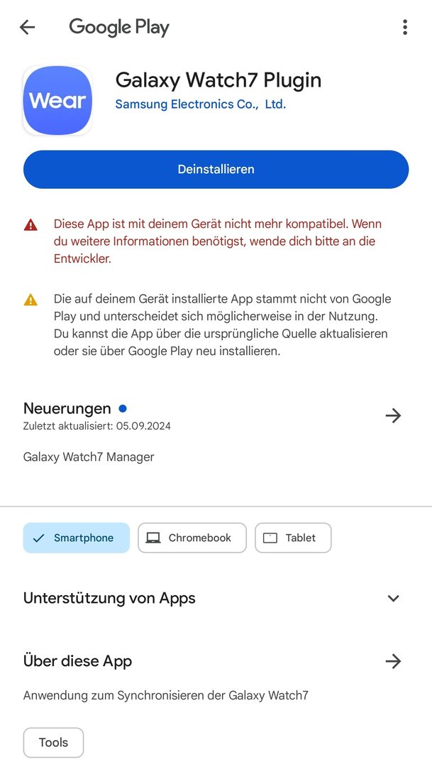 Ich habe jetzt gelesen, dass man das Galaxy Watch Plugin spezifisch für die Uhr benötigt, bei mir ist es aber definitiv nicht installiert.