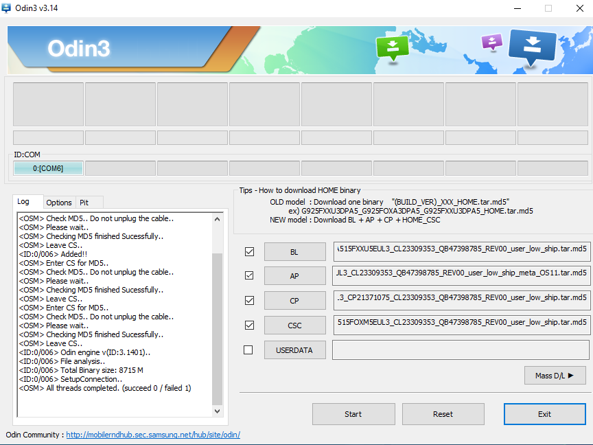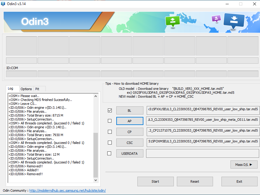 Nächster Schritt ODIN 3.14 zum neu flashen. Odin erkennt das Handy und Firmware habe ich heruntergeladen, aber flashen funktioniert nicht (siehe Anlage). Ich komme nicht weiter. Fehler: <OSM> All threads completed. (succeed 0 / failed 1)