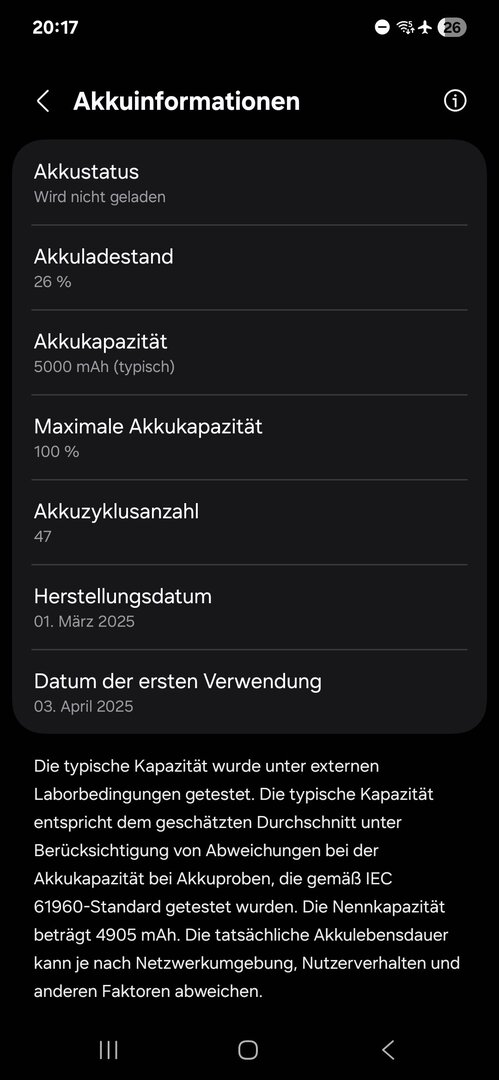 ich nutze mein A56 jetzt seit genau 5 Monaten und habe eine Akkuzyklusanzahl von 47 und eine maximale Akkukapazität von noch 100%.