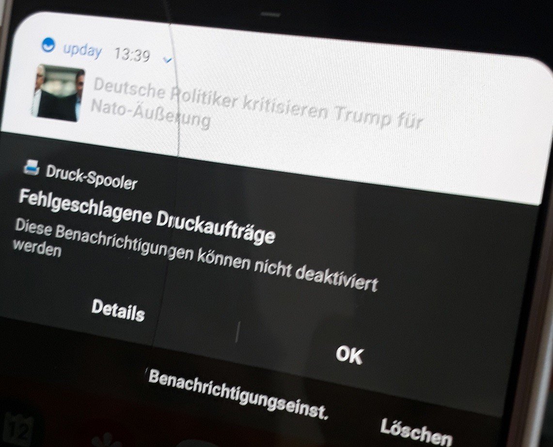 Nun kommt über das Android-Benachrichtigungsfeld die Meldung "Druck Spooler" "Fehlgeschlagene Druckaufträge", welche sich nicht deaktvieren lässt. Auch ein Neustart des Handys hat keine Lösung gebracht.