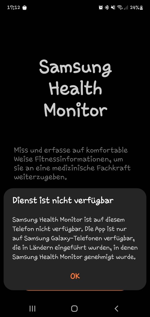 Hallo Leute ich bin langsam am verzweifeln. Hab mir die samsung watch6 gekauft und gekoppelt. Alles soweit gut aber ich kann die health monitor app für blutdruck und EKG nicht öffnen. Dann kommt immer die Fehlermeldung das der Dienst auf meinem telefon nicht verfügbar sei. Hab samsung angeschrieben die helfen aber auch nicht wirklich. Uhr is zurückgesetzt, wearable und health app alle mehrmals neu installiert aber nichts funktioniert. Samsung sagt Handy ist vom deutschen Markt und die uhr verbindet sich auf einem anderen telefon problemlos mit der helsth Monitor app. In meinem CSC steht Mid/Dbt. Kann mir jemand weiterhelfen?