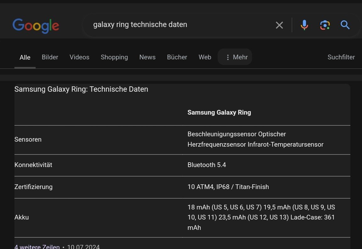 Samsung bewirbt den Galaxy Ring mit einer Aufladung 7 Tage Akkulaufzeit. Das wäre ja wirklich ein guter Wert für so ein kleines Gerät mit noch kleinerem Akku, mit all den LED's die da immer funkeln müssen.