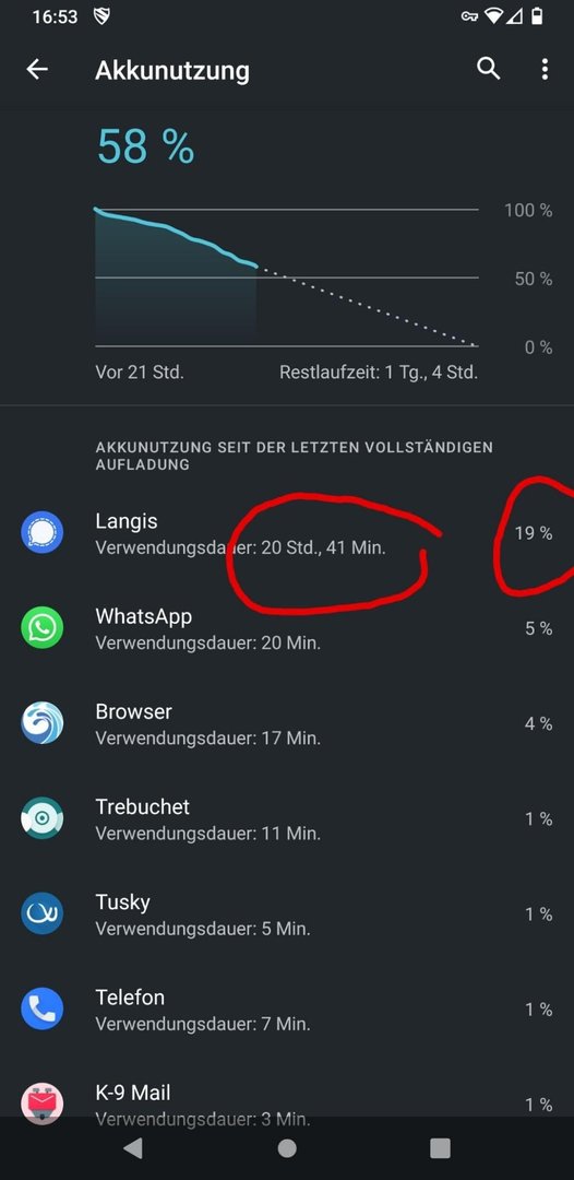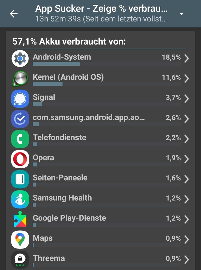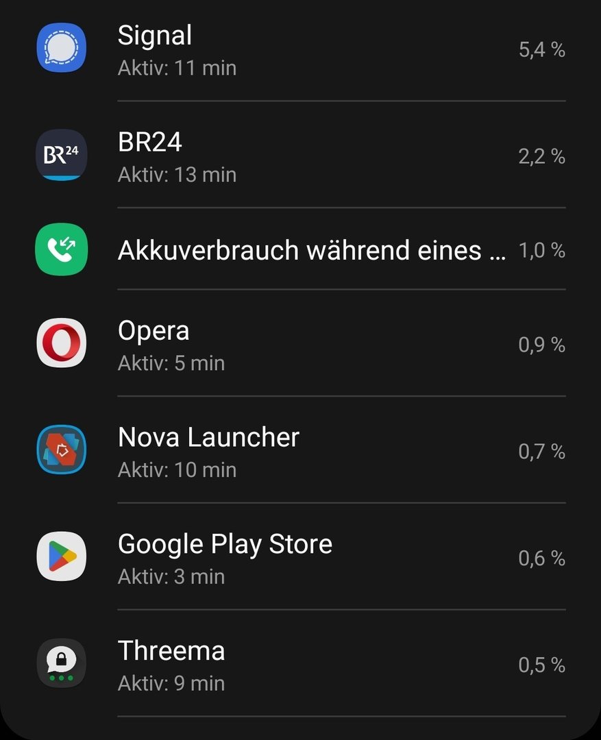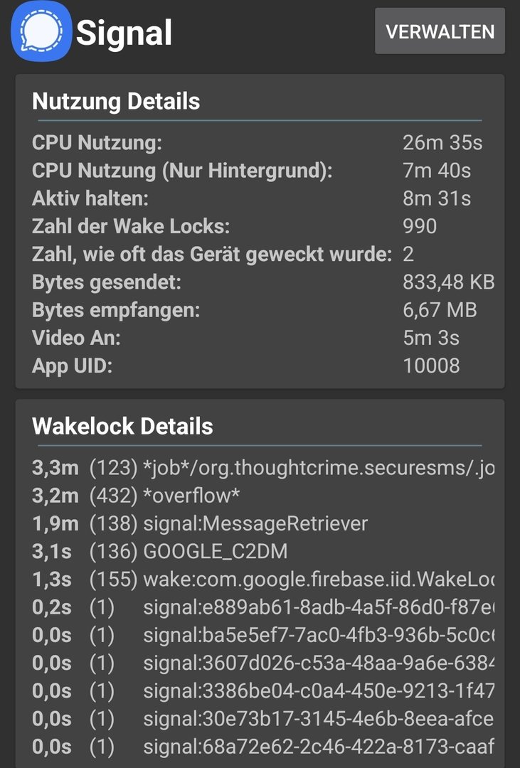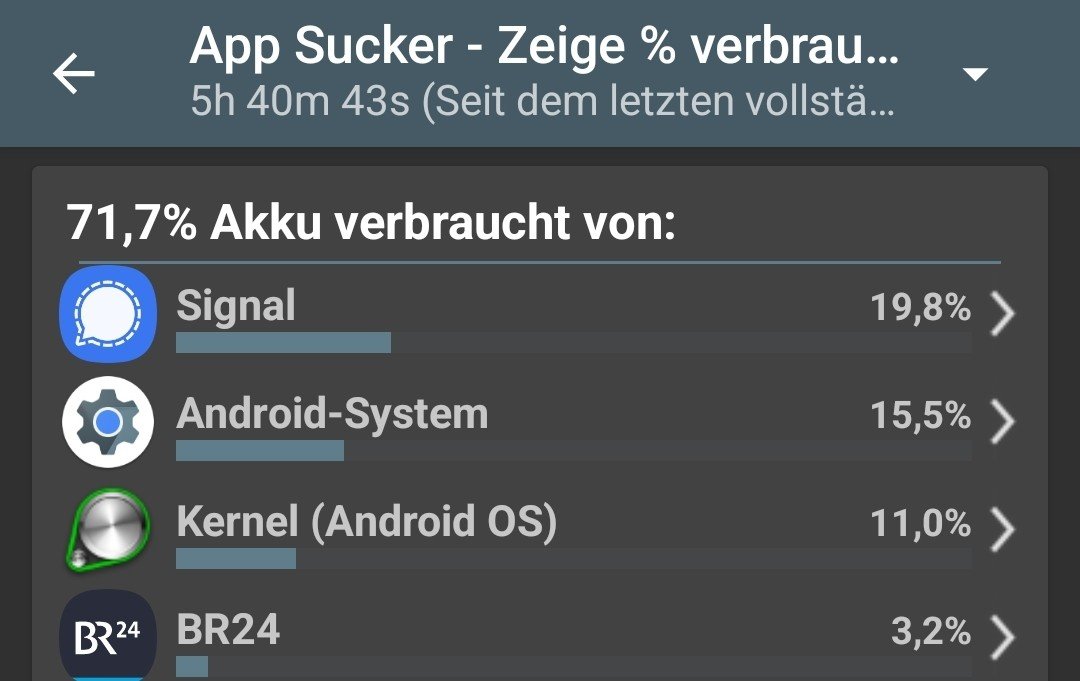 Hinweis: Der Verbrauch von Signal sieht hier unbedenklich aus mit 3.7%. Habe es heute aber auch wenig benutzt. Oft stehen nach 1 bis 2-stündiger Nutzung auch mal 15%-20% dort.