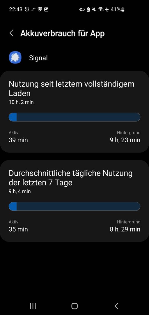nutze seit einiger Zeit Signal und habe das Problem, dass die Akkustatistik von A12 eine extreme Hintergrundnutzung anzeigt: