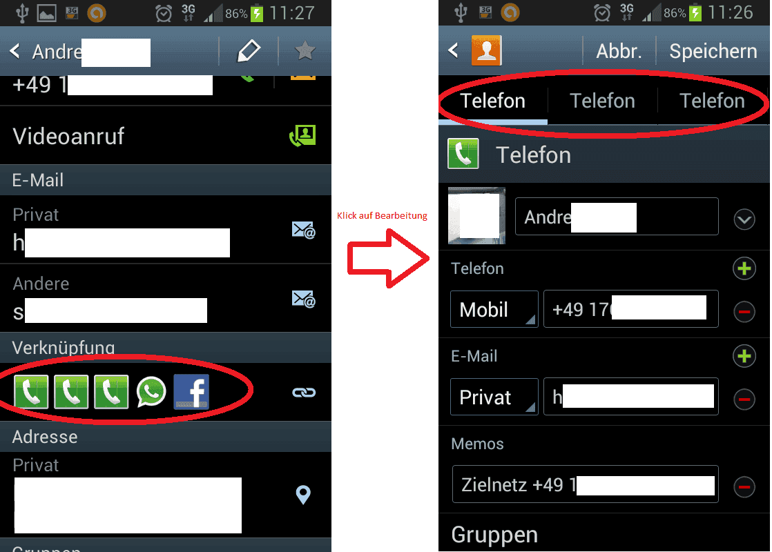 Wenn ich auf Bearbeiten klicke dann gibts aufeinmal 3 Reiter mit den Namen "Telefon". Meist ist der 1. Reiter so ausgefüllt wie ich es haben möchte. beim 2. bzw. 3. Reiter sehe ich entweder nur den Namen oder Namen und Telefonnummer.
