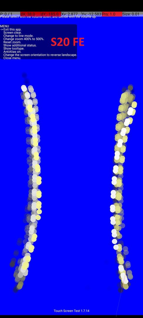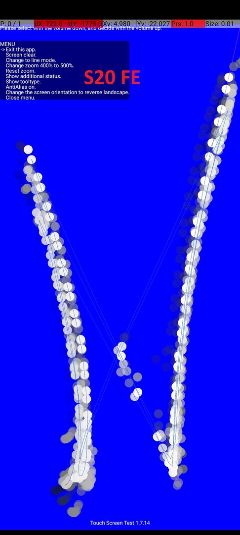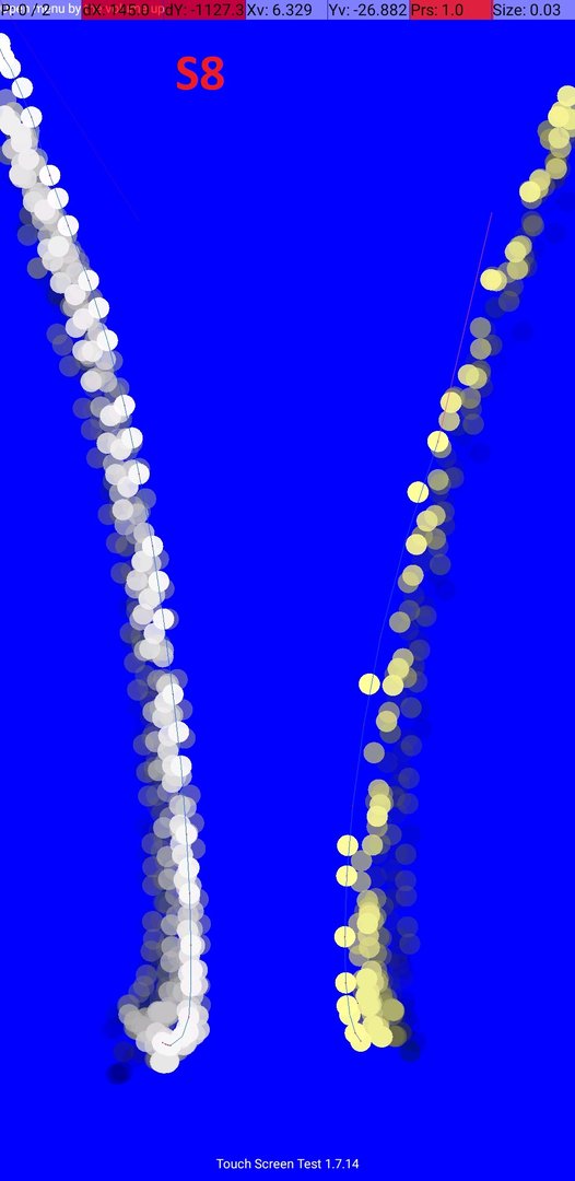 Übrigens kann ich mit der Touch Screen Test App auch die fehlerfreien Ergebnisse reproduzieren. Siehe Bild. Umso chaotischer ich die Finger links und rechts abwechselnd wische desto eher wird der Fehler sichtbar. Umso homogener desto fehlerfreier wird das Ergebnis.