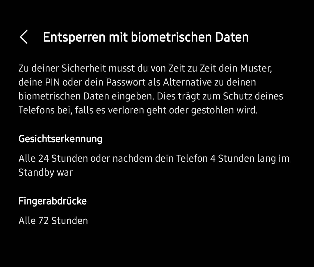 Du hast immer noch nicht kapiert wovon ich gesprochen habe. Wenn dieser Lock eintritt kommt eine Meldung im Lockscreen unten (zu deiner Sicherheit musst du deine pin eingeben), DAS IST HIER NICHT DER FALL. UND ES WAR AUCH NICHT NACH 12 STUNDEN NICHT NACH 24H NICHT NACH 72 STUNDEN WIE ES DA STEHT. SONDERN EINFACH RANDOM NACH 10 MINUTEN MEHRFACHEM EIN UND AUSSCHALTEN.Hast du SmartLock aktiviert oder eine Routine in Modi+Routinen, die das Gerät entsperrt lässt?hjfghjg schrieb:Nächster bug: Hab es grad aktiviert per doppel tap auf display, und es kommt gar kein Fingerprint, geht nicht.