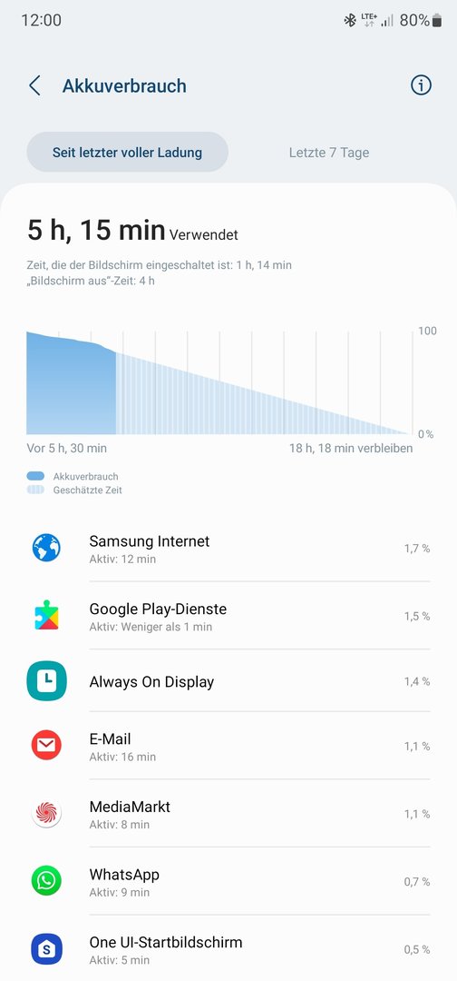 Ich habe nun nach knapp über 5 Stunden 15 Minuten Betrieb und ca 1h 15min DOT noch 80% Akku. Telefoniert habe ich unterwegs 1x kurz.
