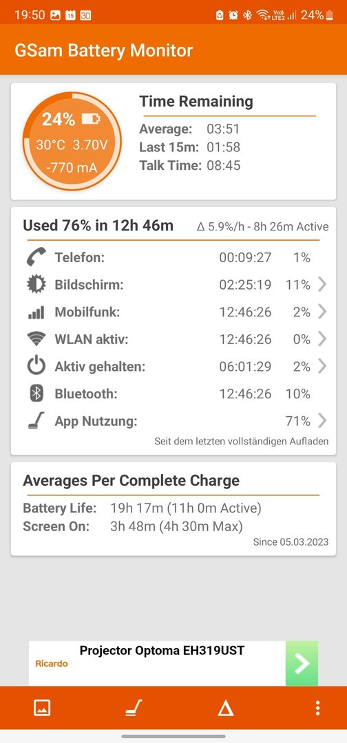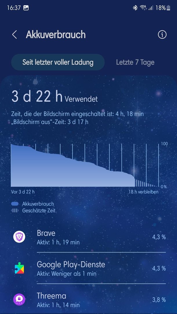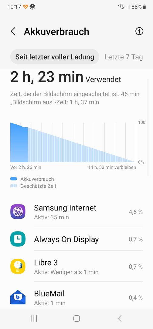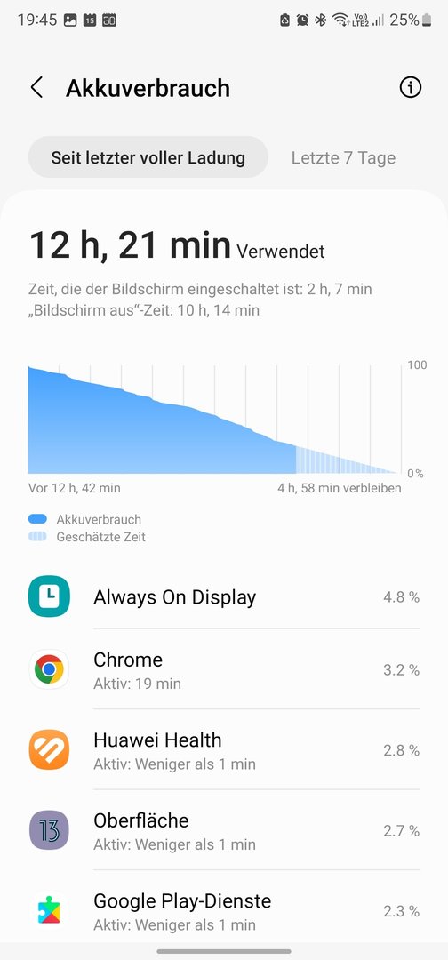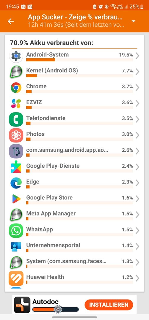 ich bin kürzlich von einem Huawei P30 pro auf das Galaxy S22 Ultra umgestiegen und etwas negativ überrascht, über die kurze Akkulaufzeit. Subjektiv empfunden liegt diese viel tiefer als bei meinem "alten" P30 Pro. Ich hab mal ein paar Screenshoots angehängt, wie ist Euer Eindruck, ist dieser Verbrauch bei diesem Handy noch als "normal" zu bezeichnen? 76% Verbrauch mit nur ca. 2h25' SOT. Habe eine Huawei Watch GT 3 Pro konstant per BT gekoppelt. GSM Battery zeigt beim App-Verbrauch interessanterweise einen hohen Verbrauch beim "Androis-System" und ebenfalls auffällig die vielen Wakelocks (5431). Wipe Cache bereits ohne Konsequenz ausgeführt.
