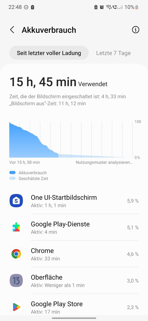 Ohne extrem zu optimieren oder wenig Apps mit Hintergrund Diensten zu nutzen sind es im Schnitt bei 3h DoT 1.5 Tage.