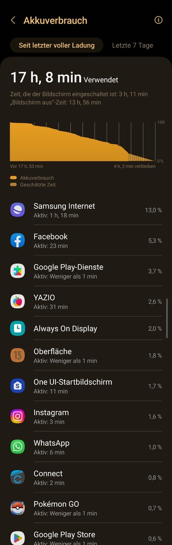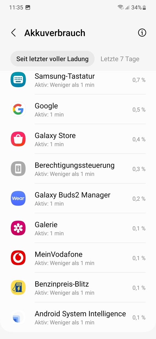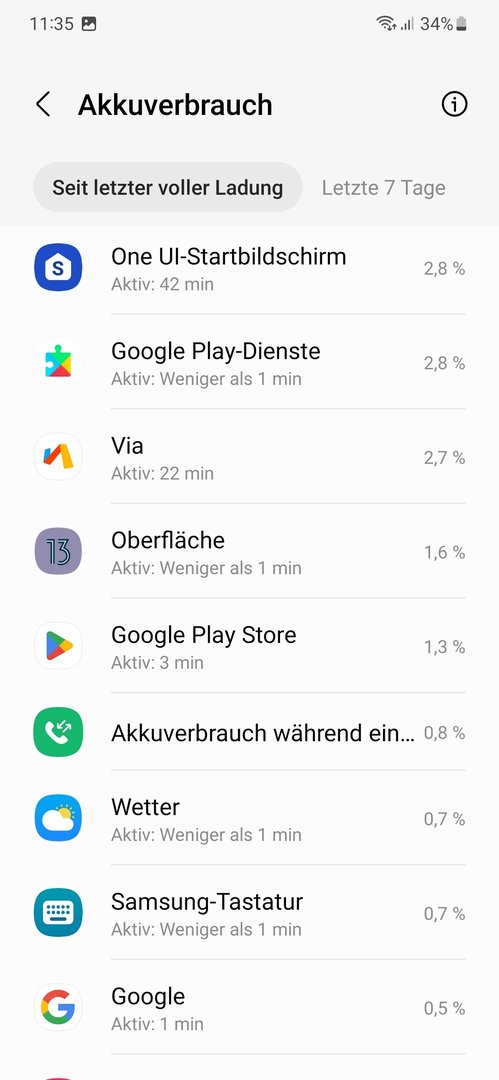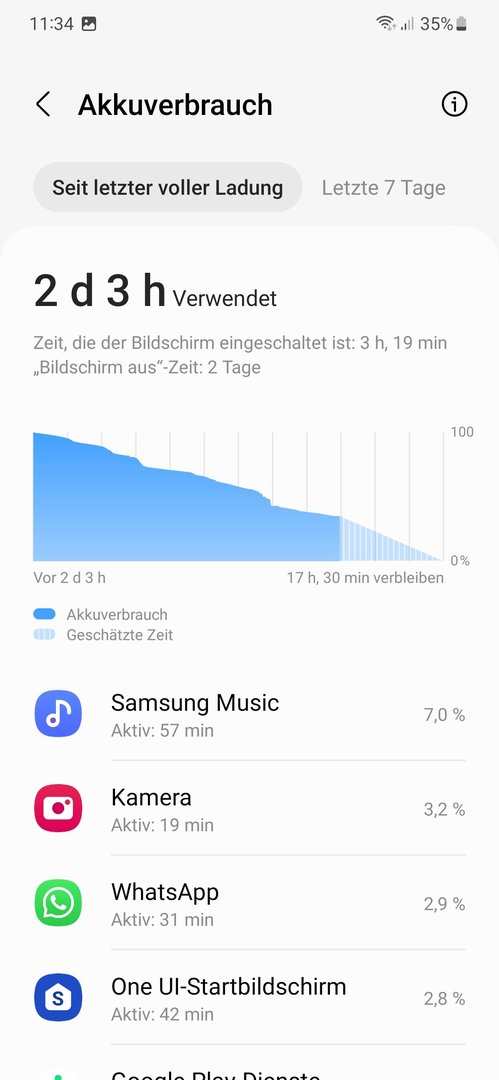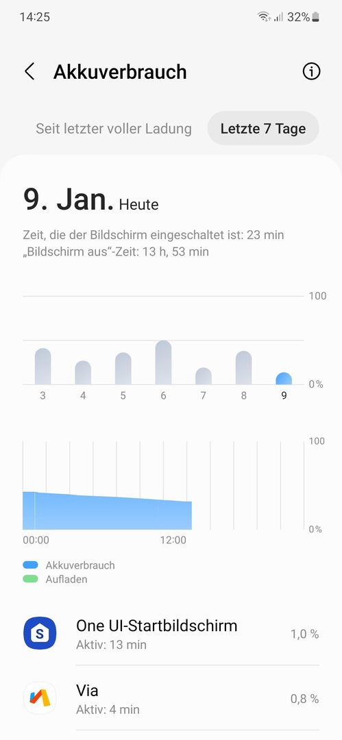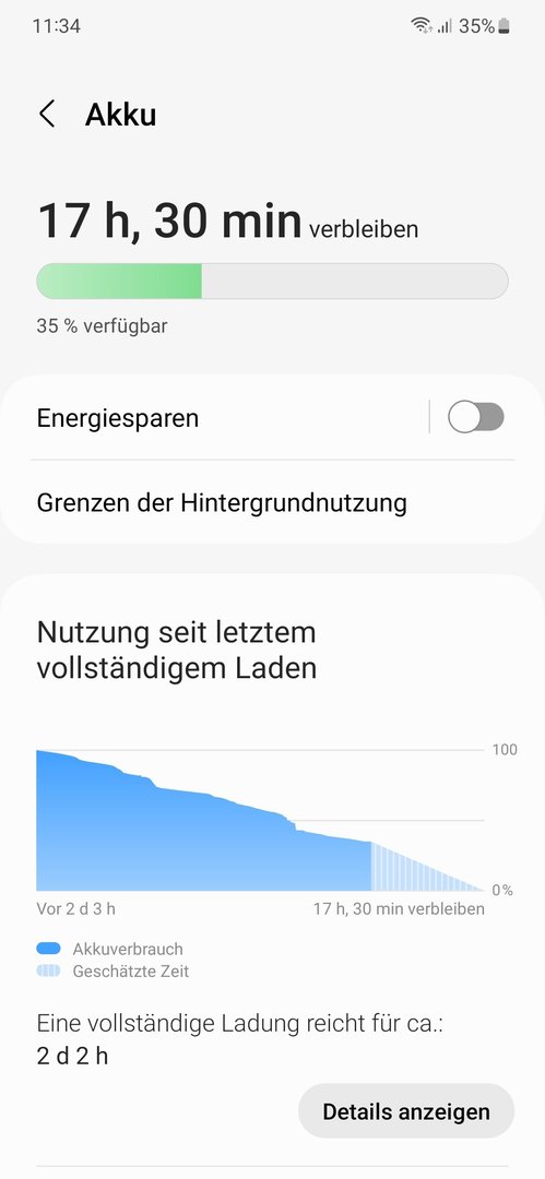 Heute 19 Uhr hatte ich nur noch 30 % mit 1,5 SoT. Wenn es so weitergeht wird das S22 bei mir nicht alt. Beim Benutzen kannst zuschauen wie die Prozent Anzeige runtergeht.