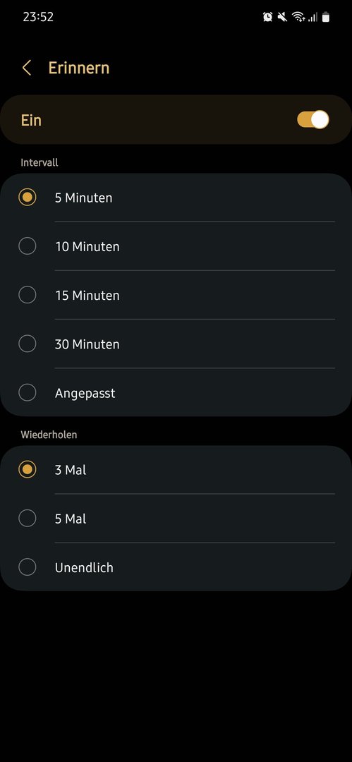 In den Optionen finde ich nichts, das einzustellen, nur die Snooze-Time und die Wiederholung des Bimmelns, die natürlich wie von Werk aus auf "unendlich" steht.
