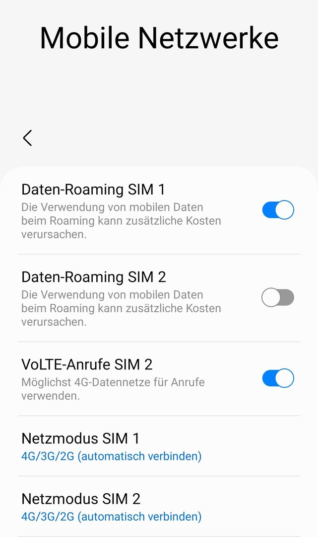 ich habe in den Einstellungen für mobile Netzwerke eine Merkwürdigkeit festgestellt. In meinem S22 befinden sich 2 SIM-Karten: In Schacht 1 Vodafone, in Schacht 2 O2. Komischerweise kann ich nur für die O2-Karte (SIM 2) VoLTE ausschalten. Für die Vodafone-Karte (SIM 1) fehlt der Schalter.