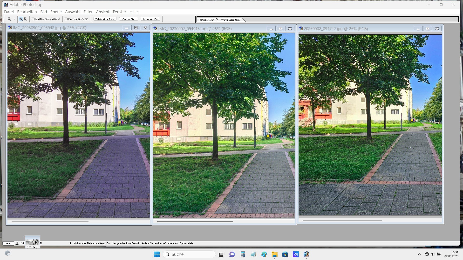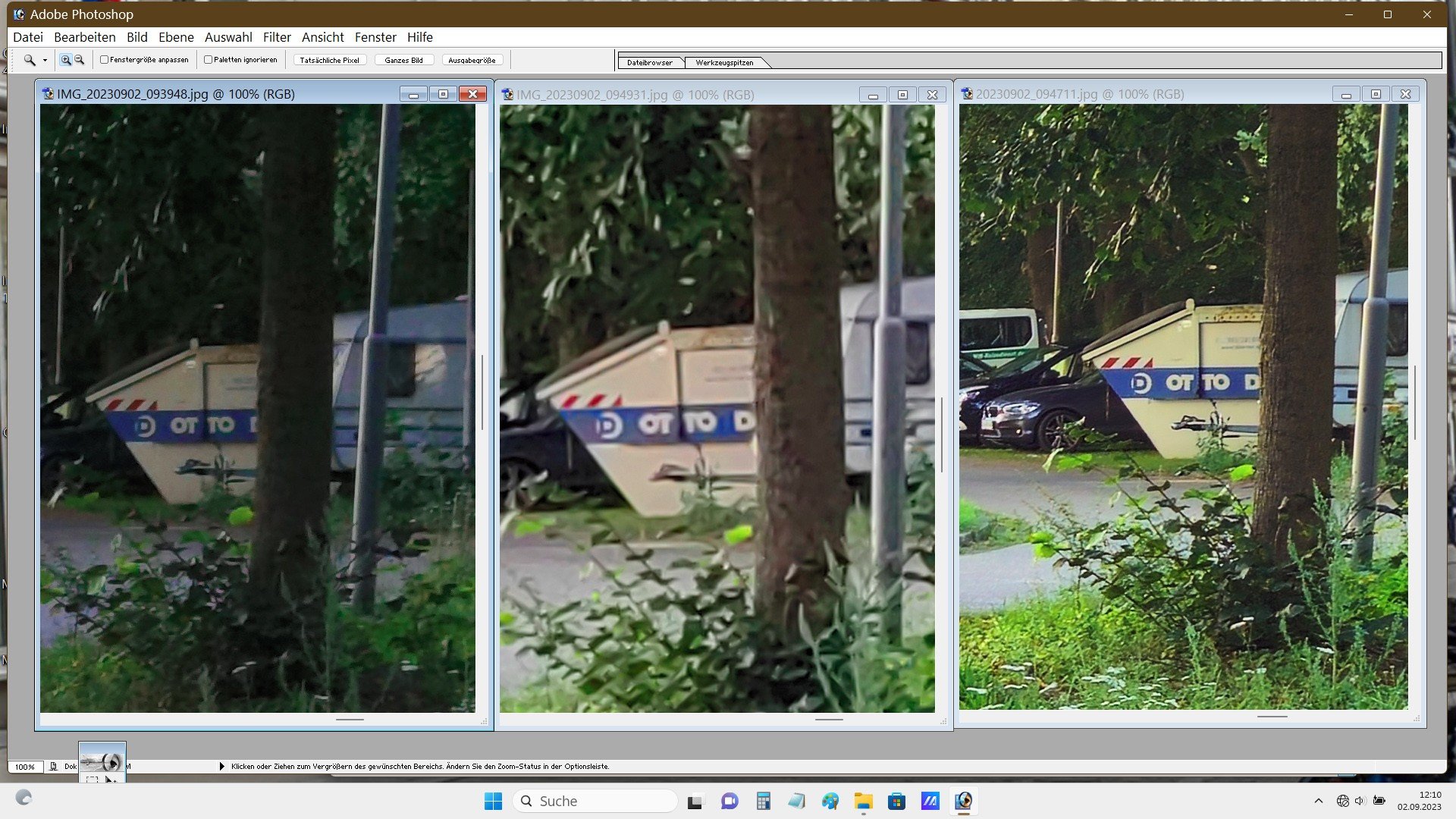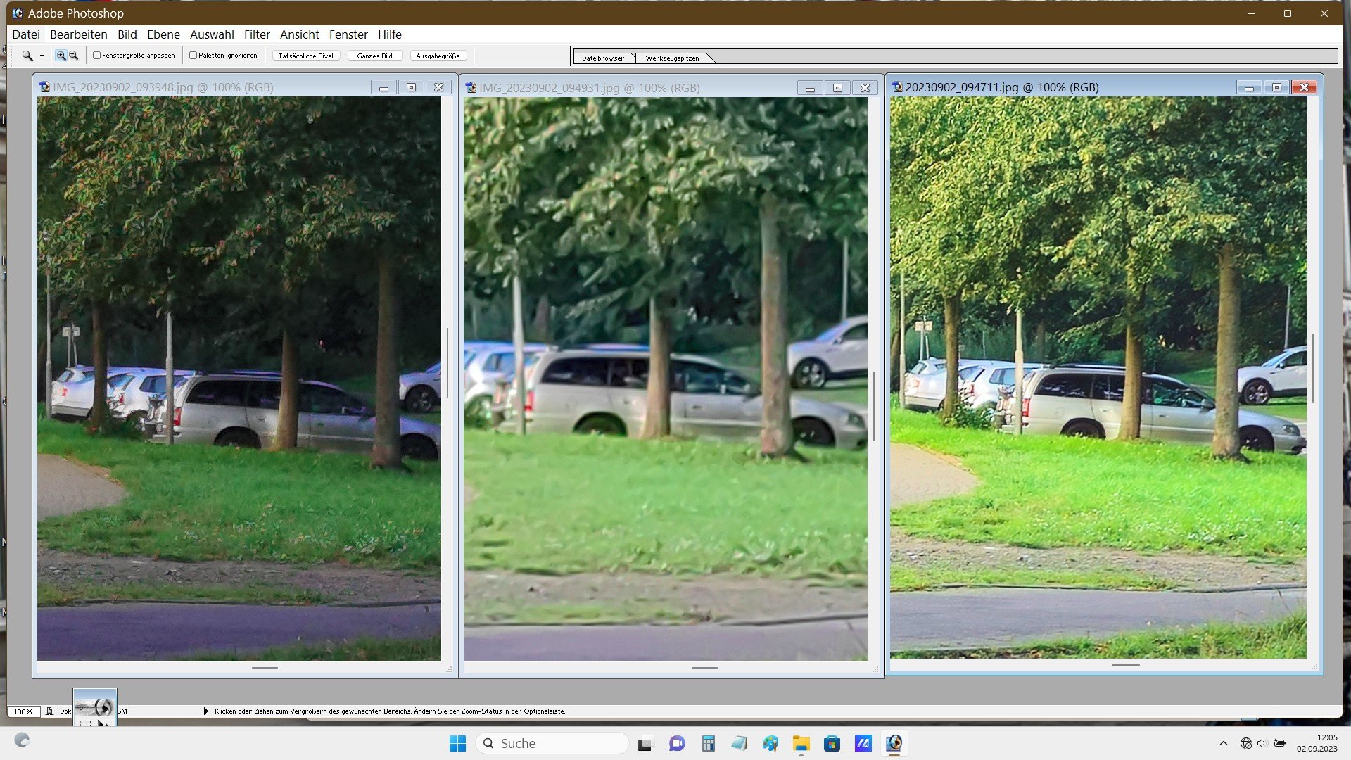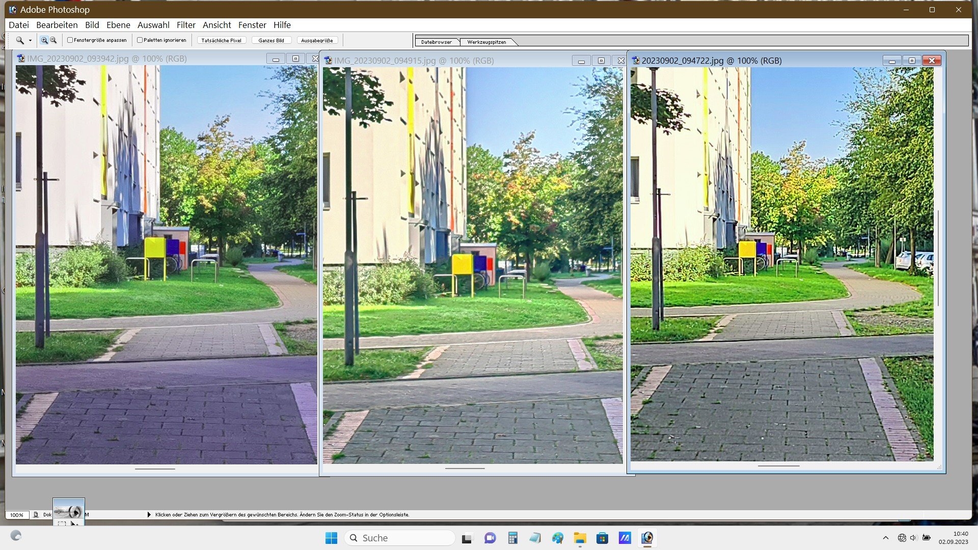Nun. Aus meiner Sicht sind die Fotos völlig ok. Du machst ein Landschftsfoto. Wo sollen da bei 10 MPix nach einem 4x4 Pixel-Binning bei diesem Motivabstand die Details herkommen? Dadurch wirkt ein Foto überschärft. Es wird ja nur jedes 16te Pixel verwendet.